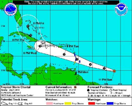 Chantal is moving west at 43 km/h and is expected to continue westward or west-northwestard for the next couple of days.