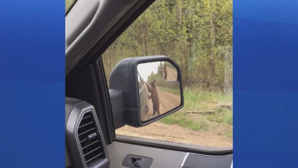 “The bear was kind of standing up at the back of my truck and you can see that his head is just barely above. I’m a hunter and I’m out in the bush a lot and as soon as I saw the bear I knew it was a very small bear, not a very mature bear.