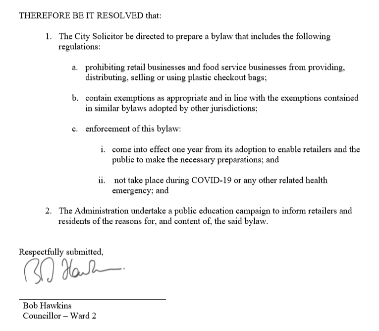 Hawkins introduced a motion at a city council meeting Wednesday, asking city administration to draft a new bylaw banning the bags.