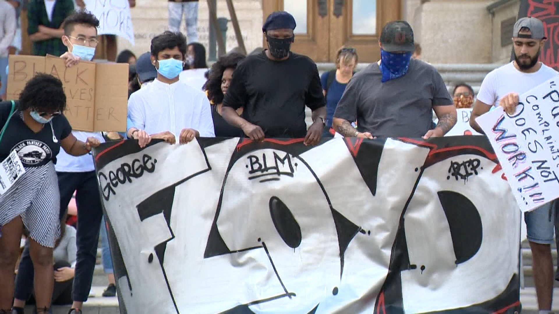 Hundreds gathered at the steps of the Saskatchewan legislature Tuesday to denounce racial injustice, while Premier Scott Moe took to social media to denounce those who defaced a war memorial not far from the building.