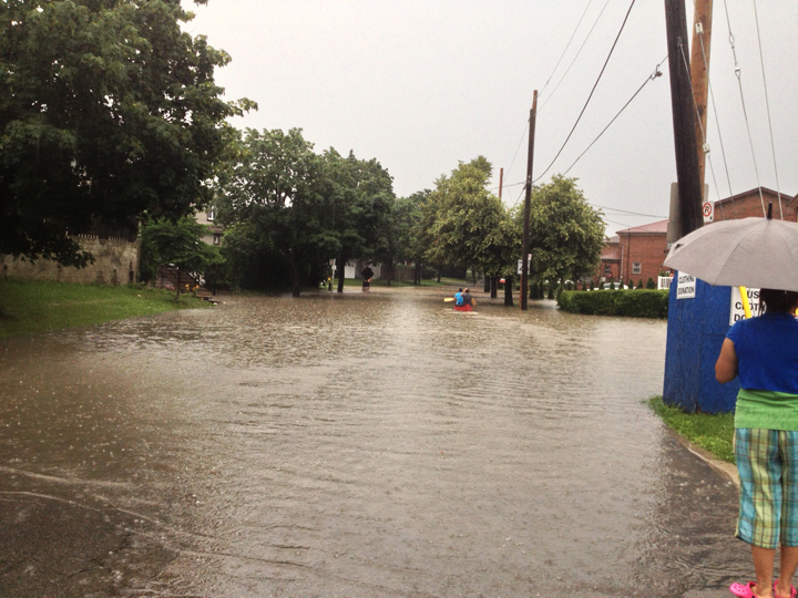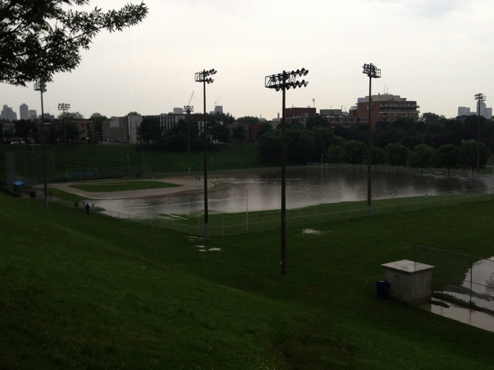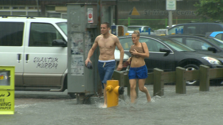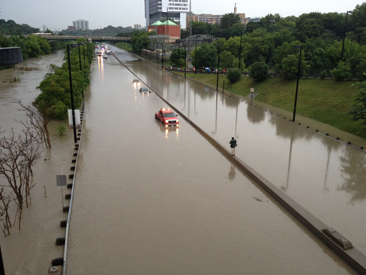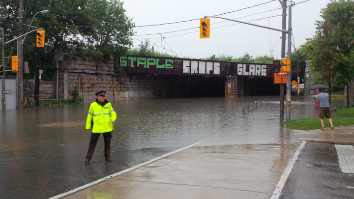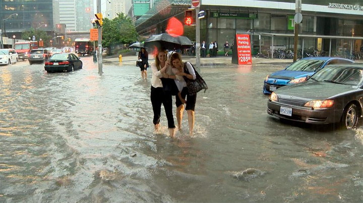 TORONTO – A massive storm hit Toronto Monday evening just in time for the rush hour commute. Roads were reduced to a crawl as the skies blackened and rain soaked the city. Subway service throughout the city was halted as the rain interfered with signal systems, flooded subway stations, highways and downtown streets. Photos from the storm above.