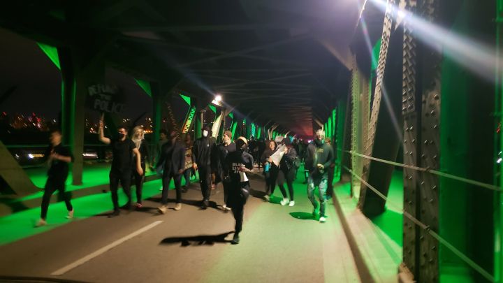 As of 11 p.m., the crowd continued marching through the city’s core and were planning to head south of the river to Whyte Avenue.