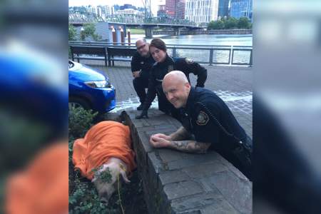 The Portland Police Department tweeted photos of the operation on Sunday morning, in which officers can be seen watching over the sleepy pig. Authorities were hoping to find the pig’s owner, although no one has come forward yet. They say the pig appeared to have been abandoned overnight.