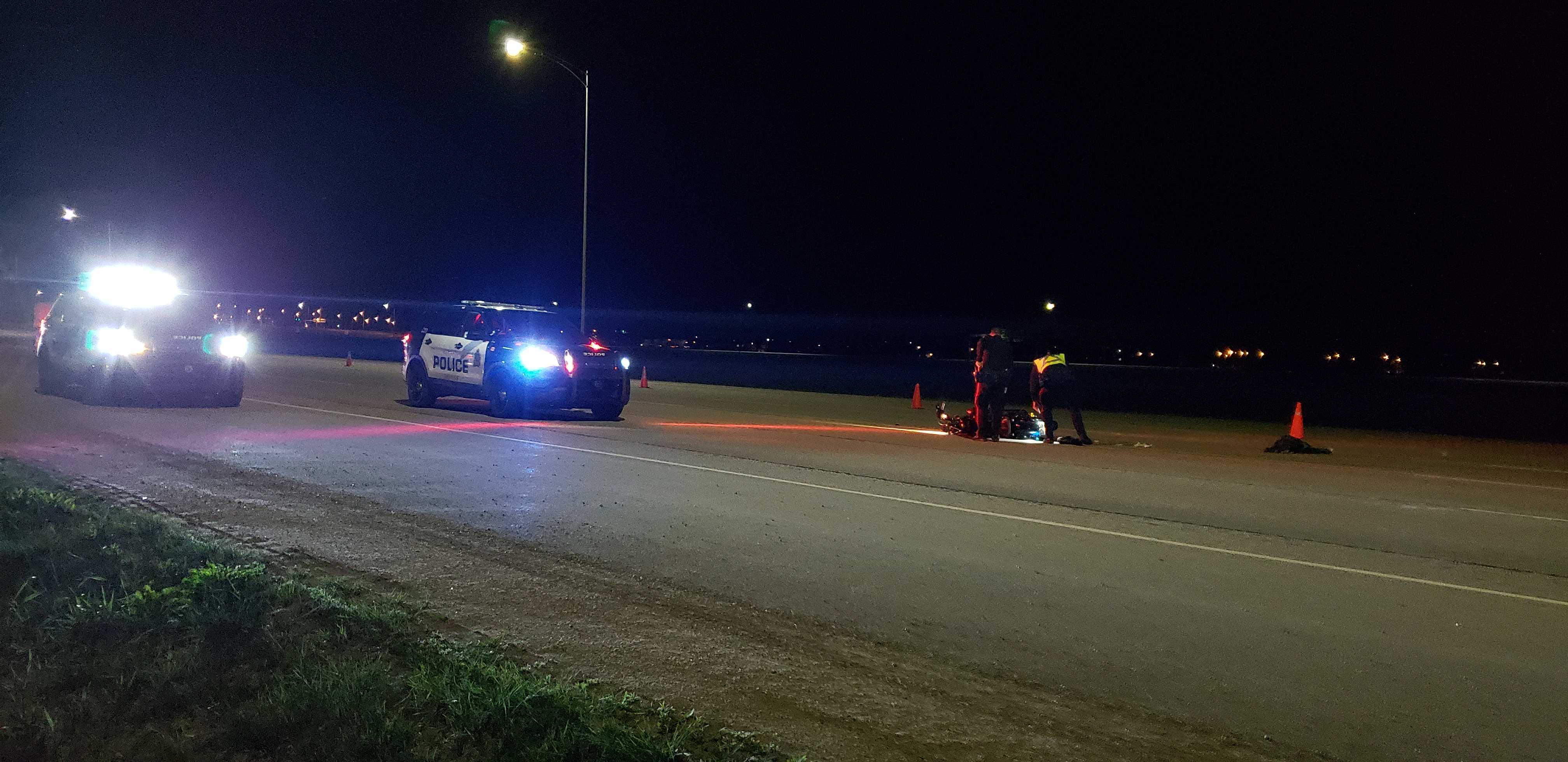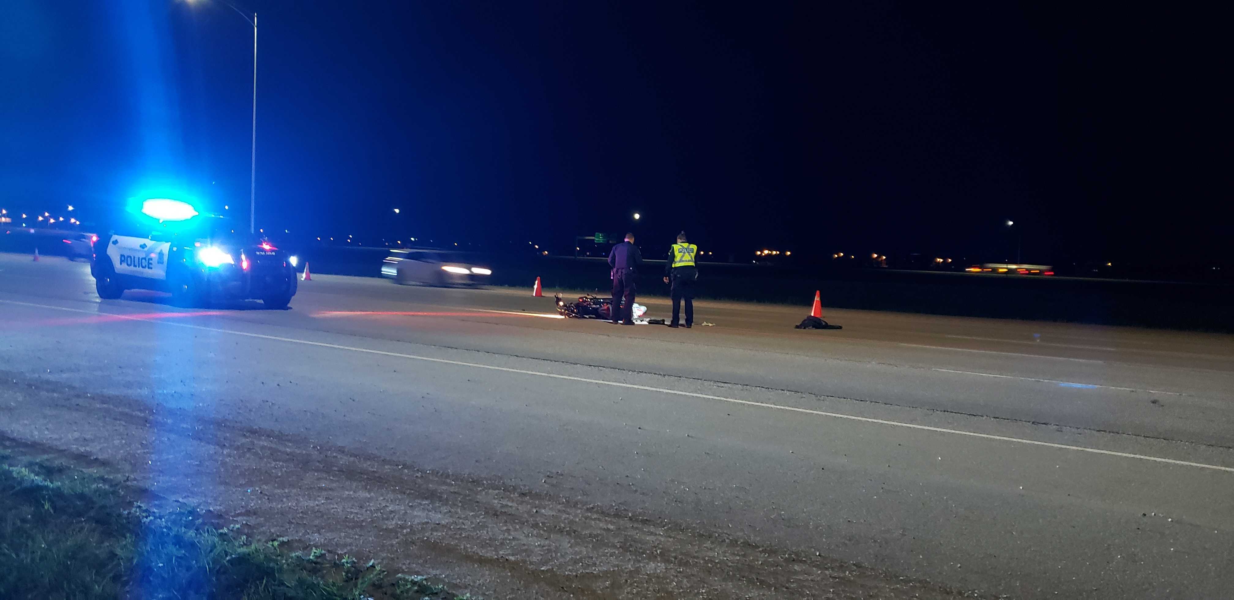 Police on scene said a man in his 40s was sent to hospital with “undetermined injuries” after his motorcycle crashed.