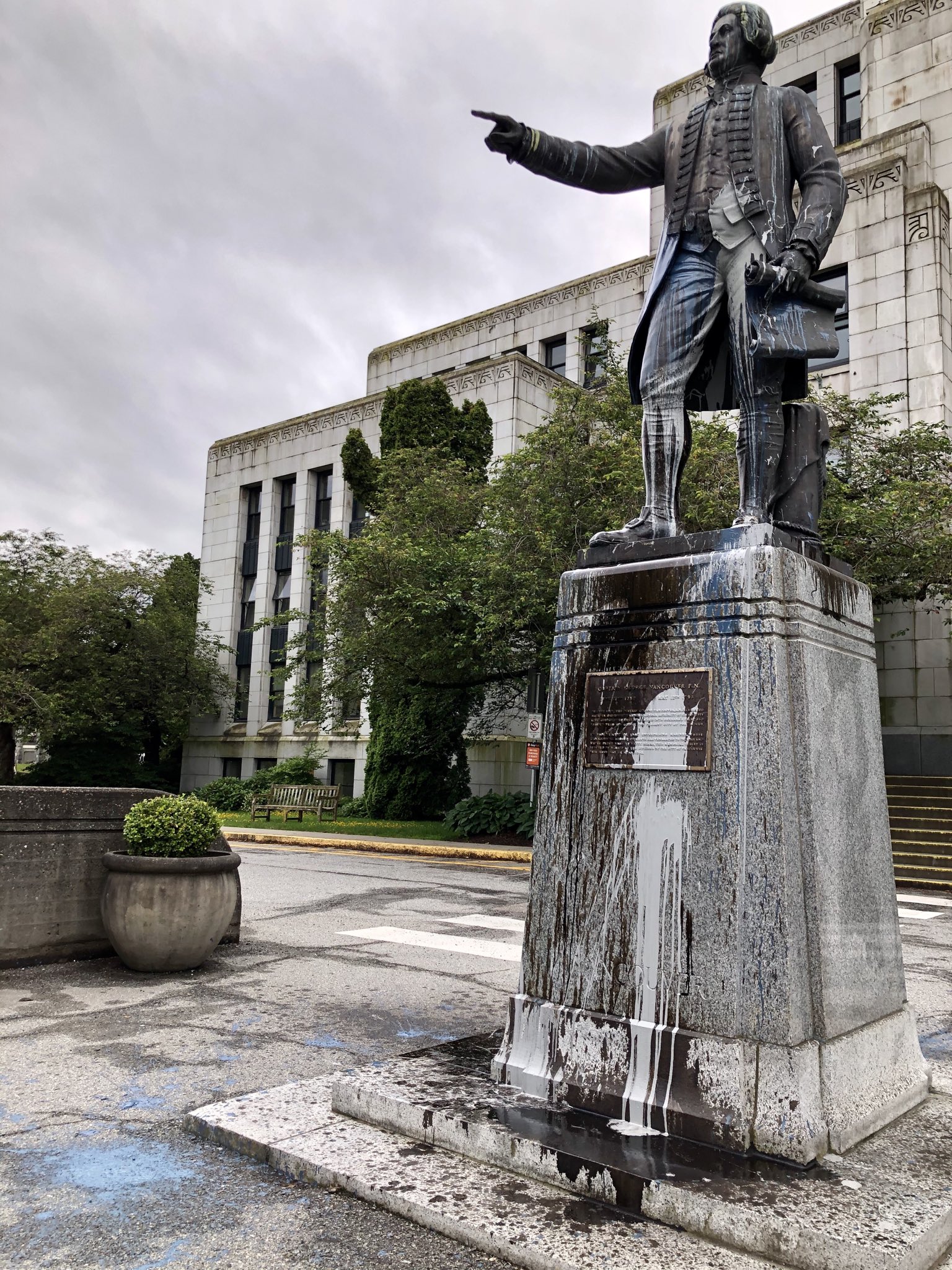 The statue of George Vancouver outside city hall was vandalized overnight Wednesday, security officials say.