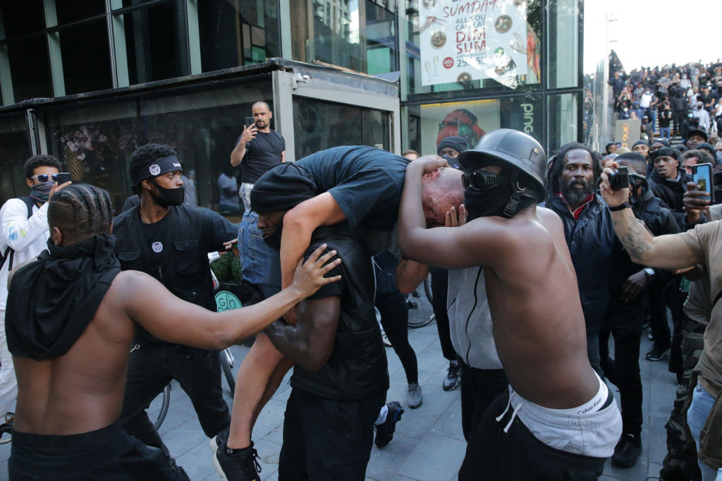 During the Black Lives Matter (BLM) protests on Saturday in London, spurred by the death of George Floyd, a Black man was seen carrying an injured white man to safety after he was beaten up.