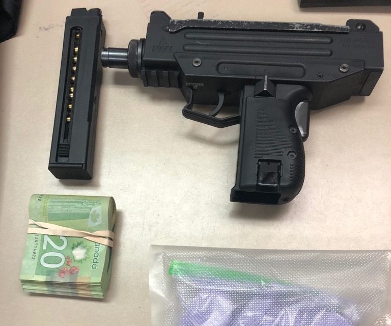 Officers allegedly located a fully loaded automatic submachine handgun, two knives along with crystal meth, Xanax, 137 grams of purple heroin and cash.