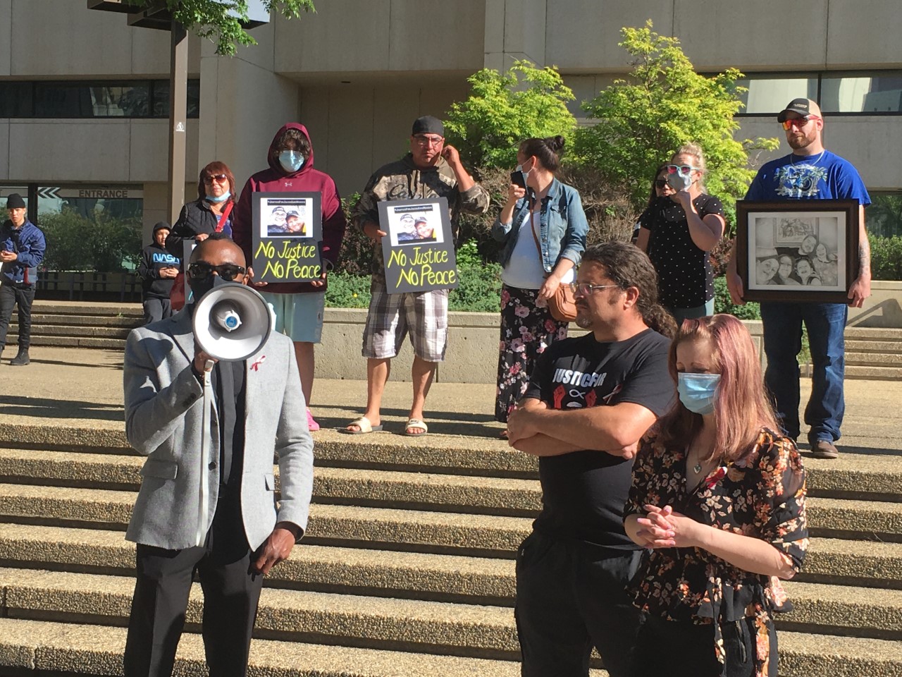 The deaths of Jacob Sansom of Nobleford and his uncle, Maurice Cardinal of Bonnyville, were still very raw for the men’s family and friends who rallied outside the Edmonton Law Courts on Tuesday as a bail hearing was held for one of the two men accused in their deaths.