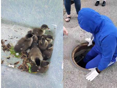Morgan didn’t waste a second and was able to scoop up six ducklings from the drain, but soon realized there were more trapped in a sewage pipe, out of reach from the street.