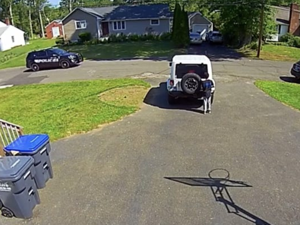 The clip shows Eliah, 10, shooting hoops on the property of his Connecticut family home last week. As a police car rolls down his street, he stops in his tracks and hides behind a vehicle in his driveway. When the car drives away, he continues playing basketball.