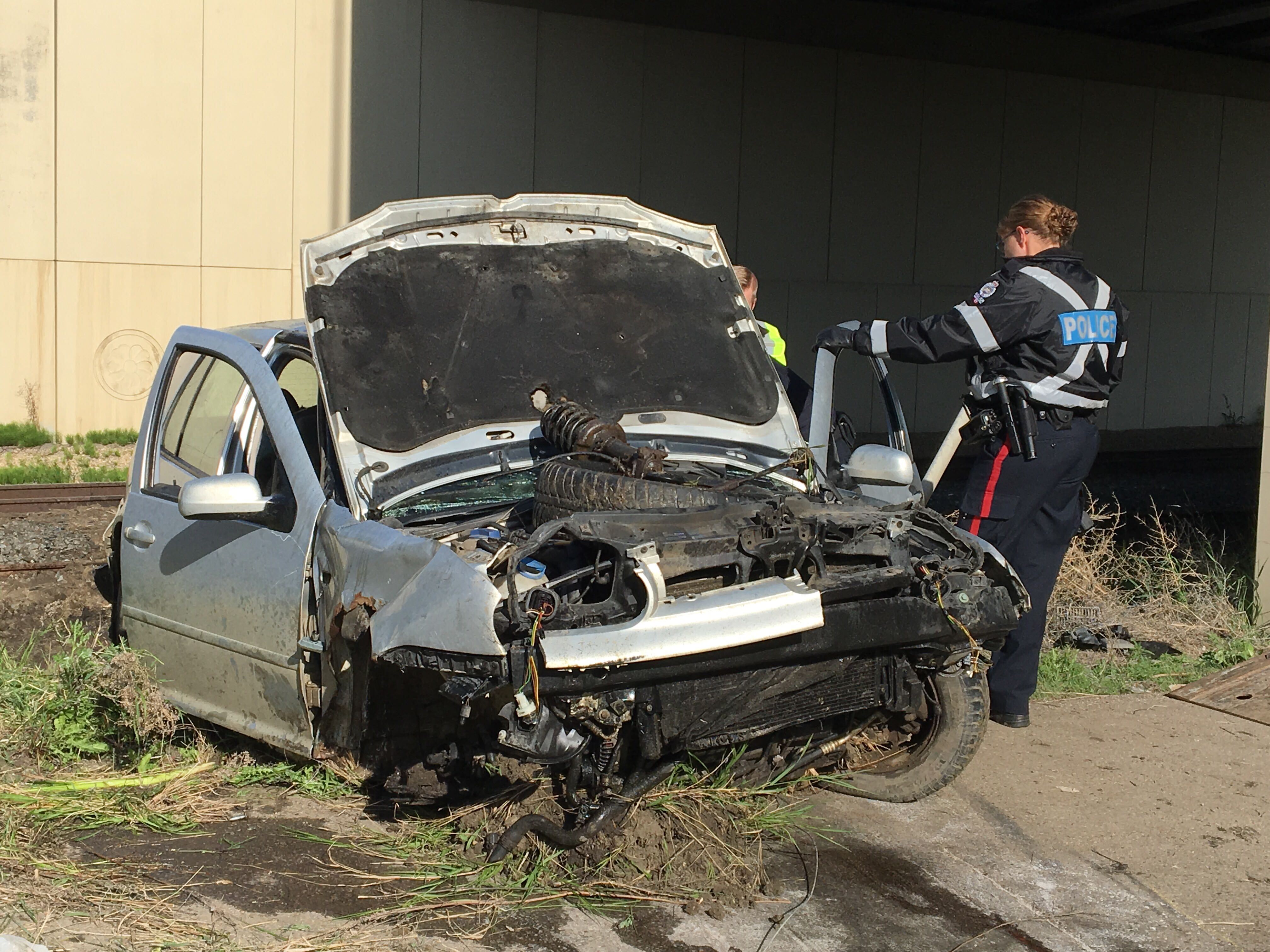 Police on scene Thursday morning said the car travelled about 50 metres before landing on the walking trail beside Parsons Road. The vehicle then slid into the ditch, impacting the side of the railway, police said.