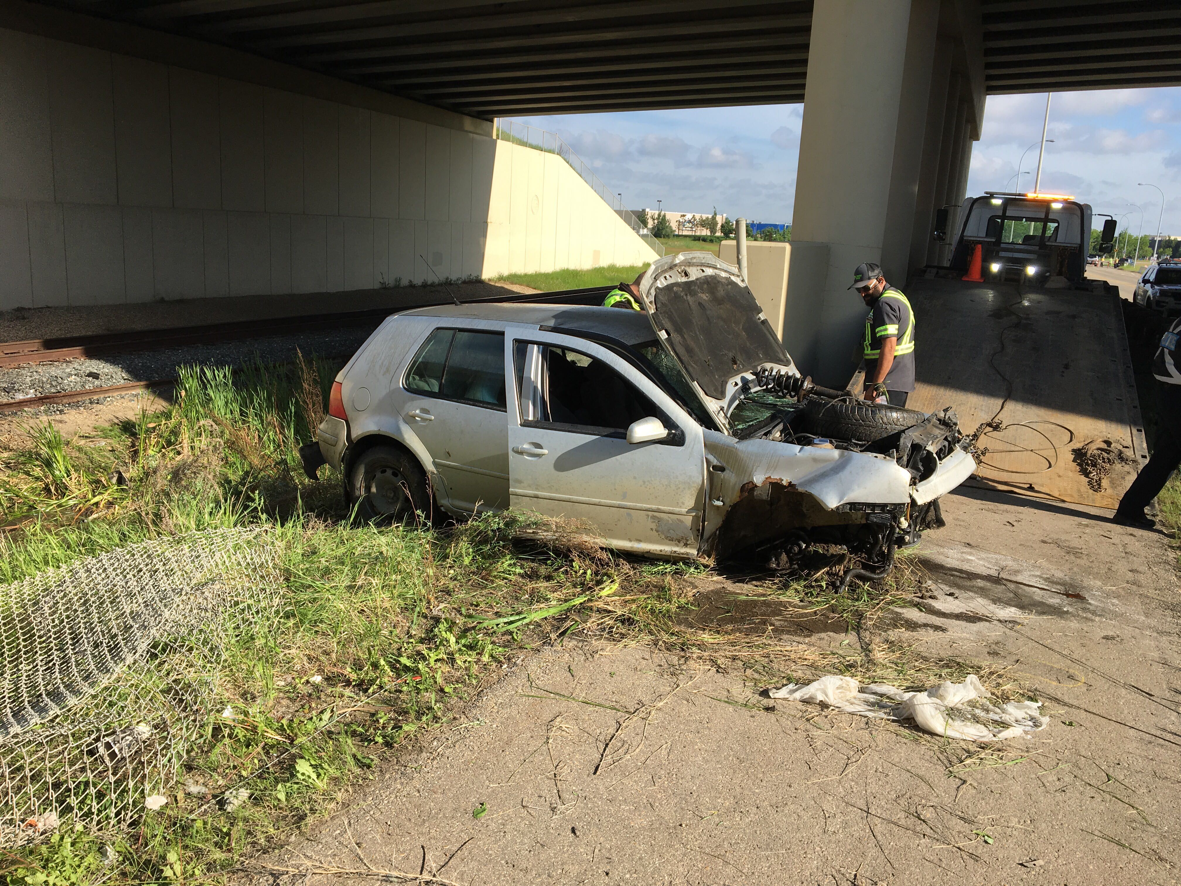 At around 3:10 a.m. Thursday, police said a Volkswagen Golf was heading west on Anthony Henday Drive just before Parsons Road when the car “launched over the north and southbound lanes of Parsons Road and came to rest a short distance away from the train tracks in the area.”