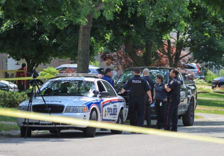 Police said four suspects arrived at a home in London in two vehicles at 4:40 am and forced their way inside. A “physical altercation occurred which culminated with the victim being shot by one of the suspects.”