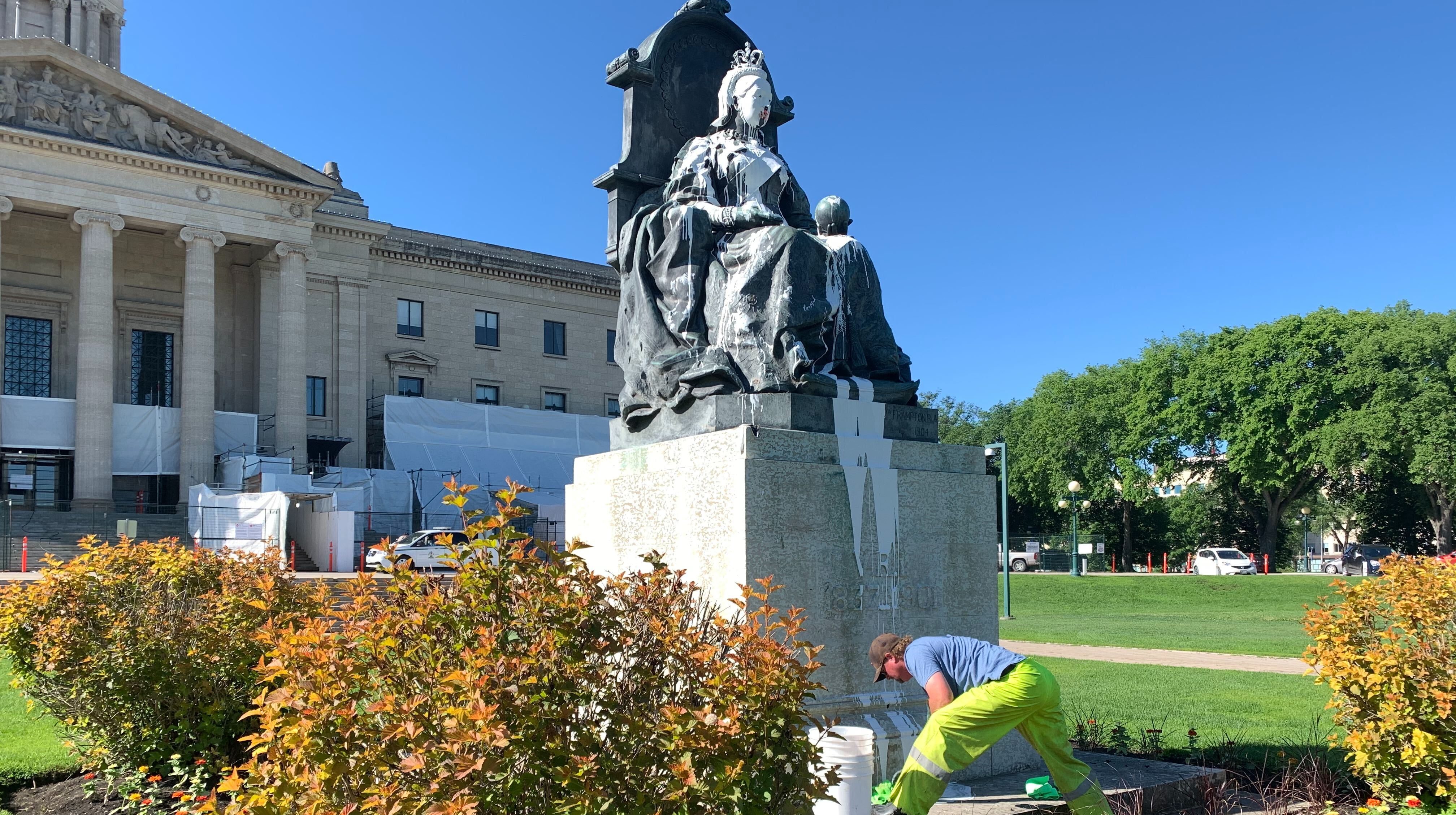 Winnipeg Graffiti Control workers were on scene Wednesday morning cleaning up the statue, which was covered in white paint.
