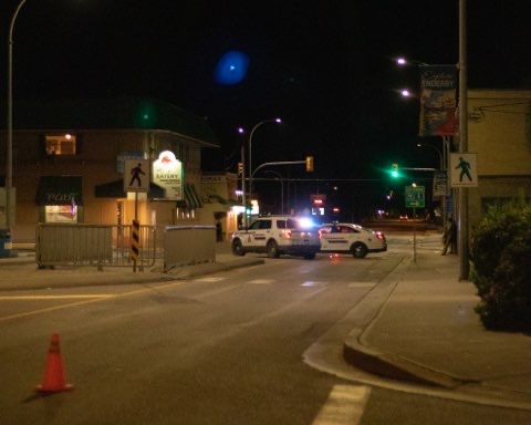 Caleb Vanderhoek said he was driving past the scene in downtown Enderby, B.C., near the Bull Pen liquor store on Cliff Avenue around 9 p.m. when he spotted several police cruisers.