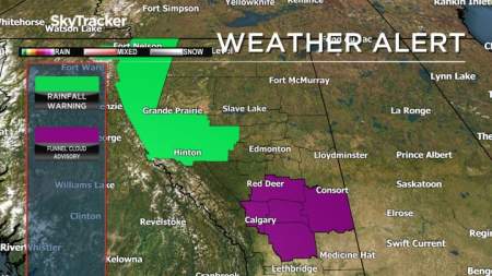 In an advisory posted Wednesday, Alberta Environment and Parks said the rain that started Tuesday and which is not expected to taper off until Thursday could see some areas hit with between 50 and 80 millimetres of rain, “with localized higher amounts of up to 100 mm possible in an area surrounded by Grand Prairie, Hinton and Whitecourt.”