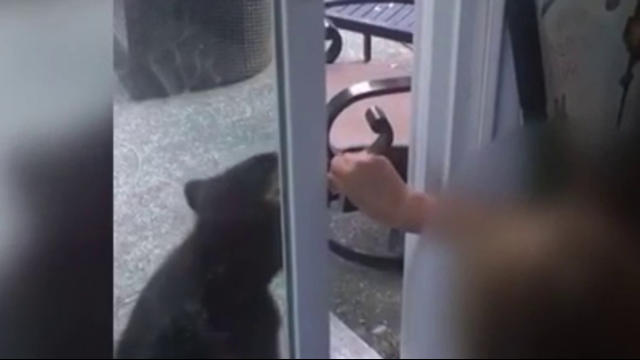 In the video, two girls are seen feeding what appear to be crackers and French fries to two bear cubs and a sow from the open doors and windows of their home.