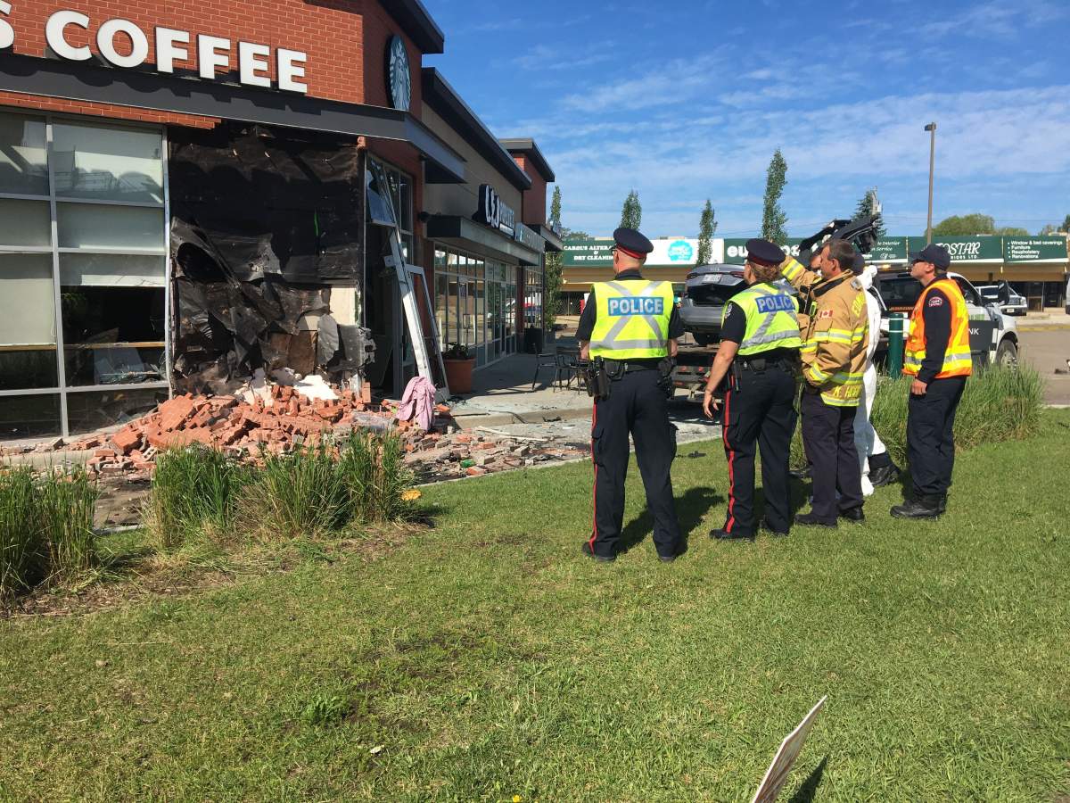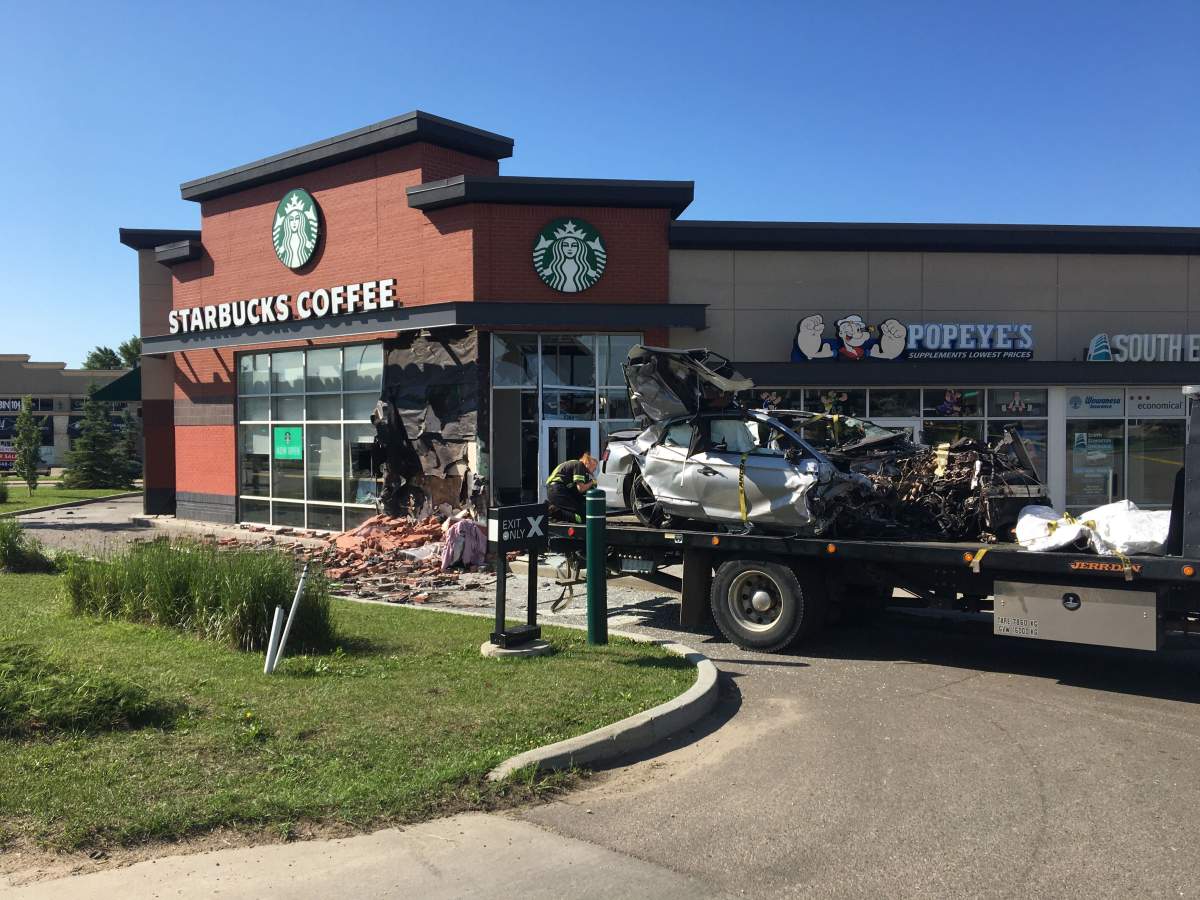 The crumpled wreckage of the light-coloured sedan could be seen on a section of grass outside a badly damaged Starbucks.