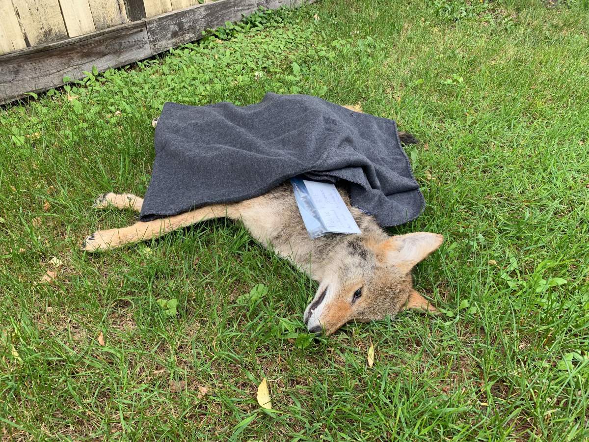 He decided against going out on Wednesday night but went out Thursday morning to find a dead coyote in the alley. It was later moved to a nearby grassy area and covered with a blanket. A note posted on the fence stated a resident had called the city to report the incident.
