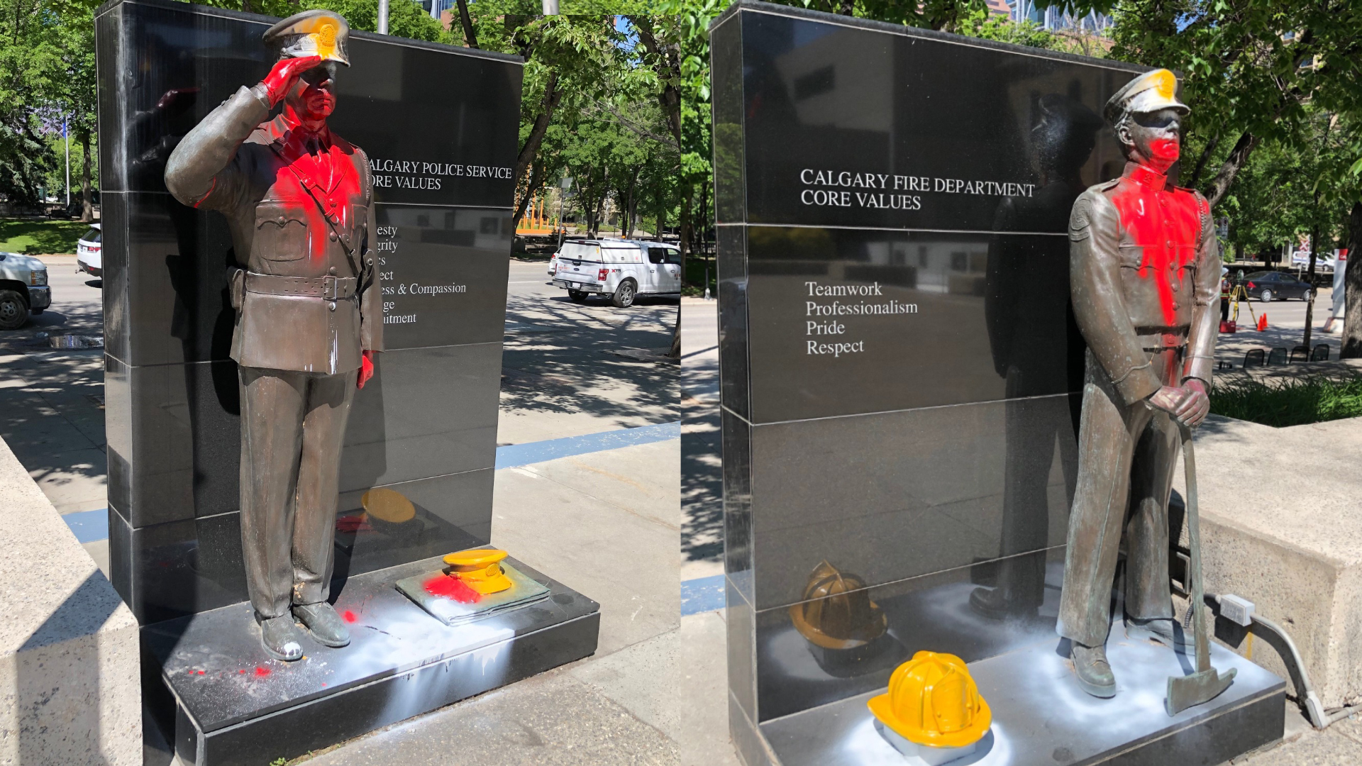 Splatters of paint were washed off statues of a firefighter and police officer outside Calgary City Hall on Friday afternoon after they were vandalized.