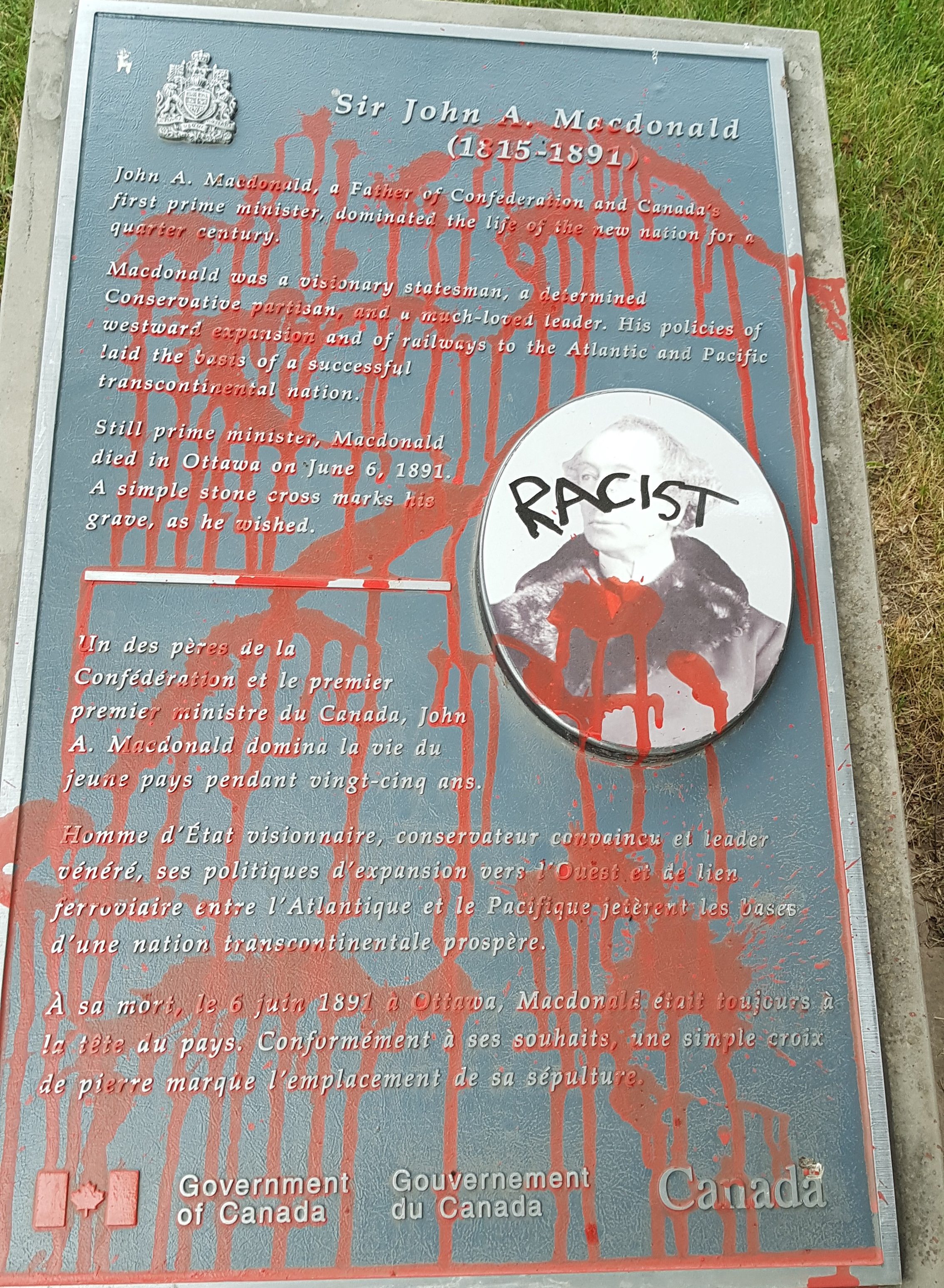 Two plaques dedicated to Macdonald, beside his gravesite, are now covered due to acts of vandalism that police suspect occurred overnight on July 1 or on July 2.