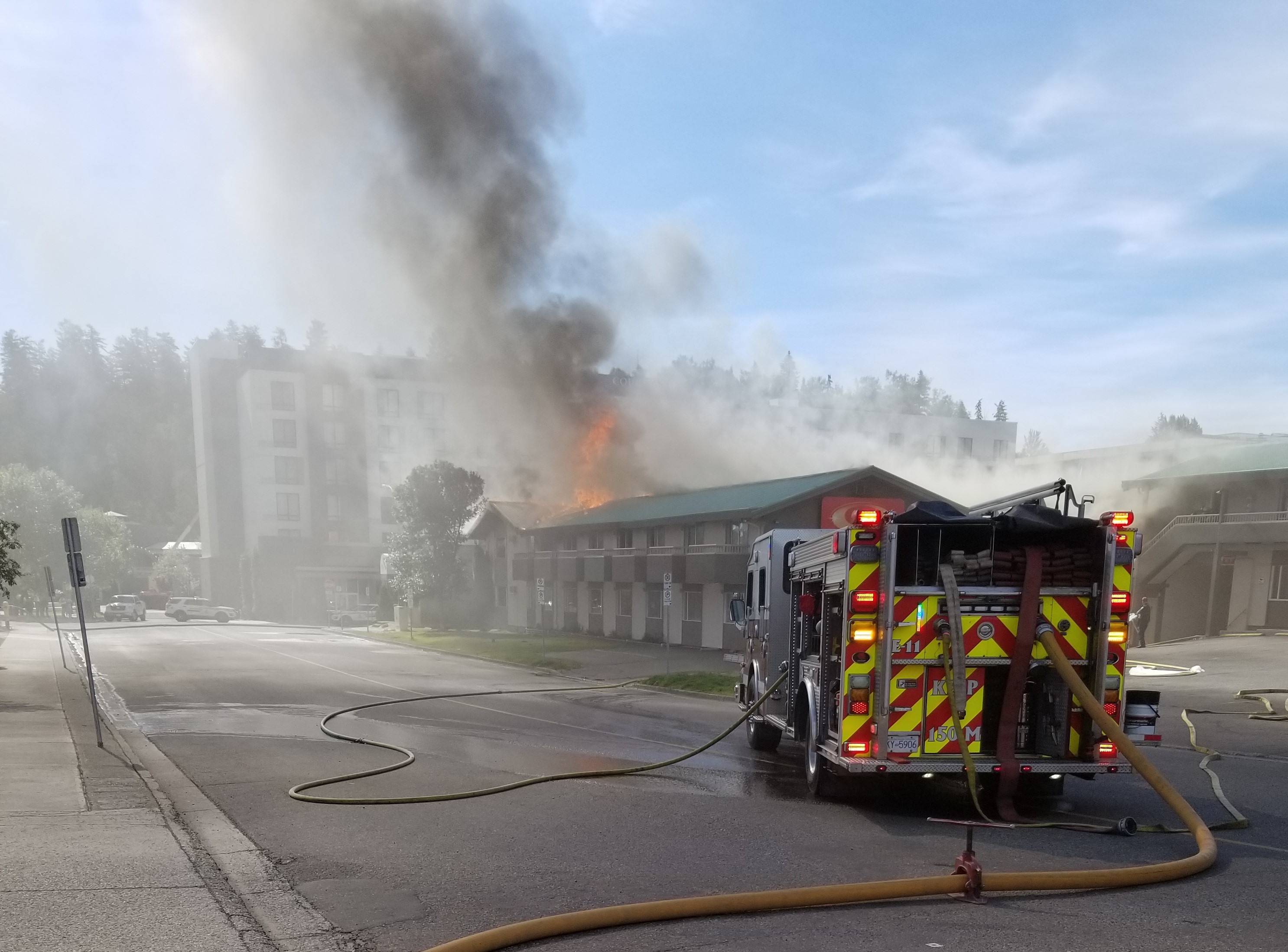 Flames badly damaged one wing of the hotel and forced the closure of several streets in downtown Prince George Wednesday, including a stretch of Highway 16.