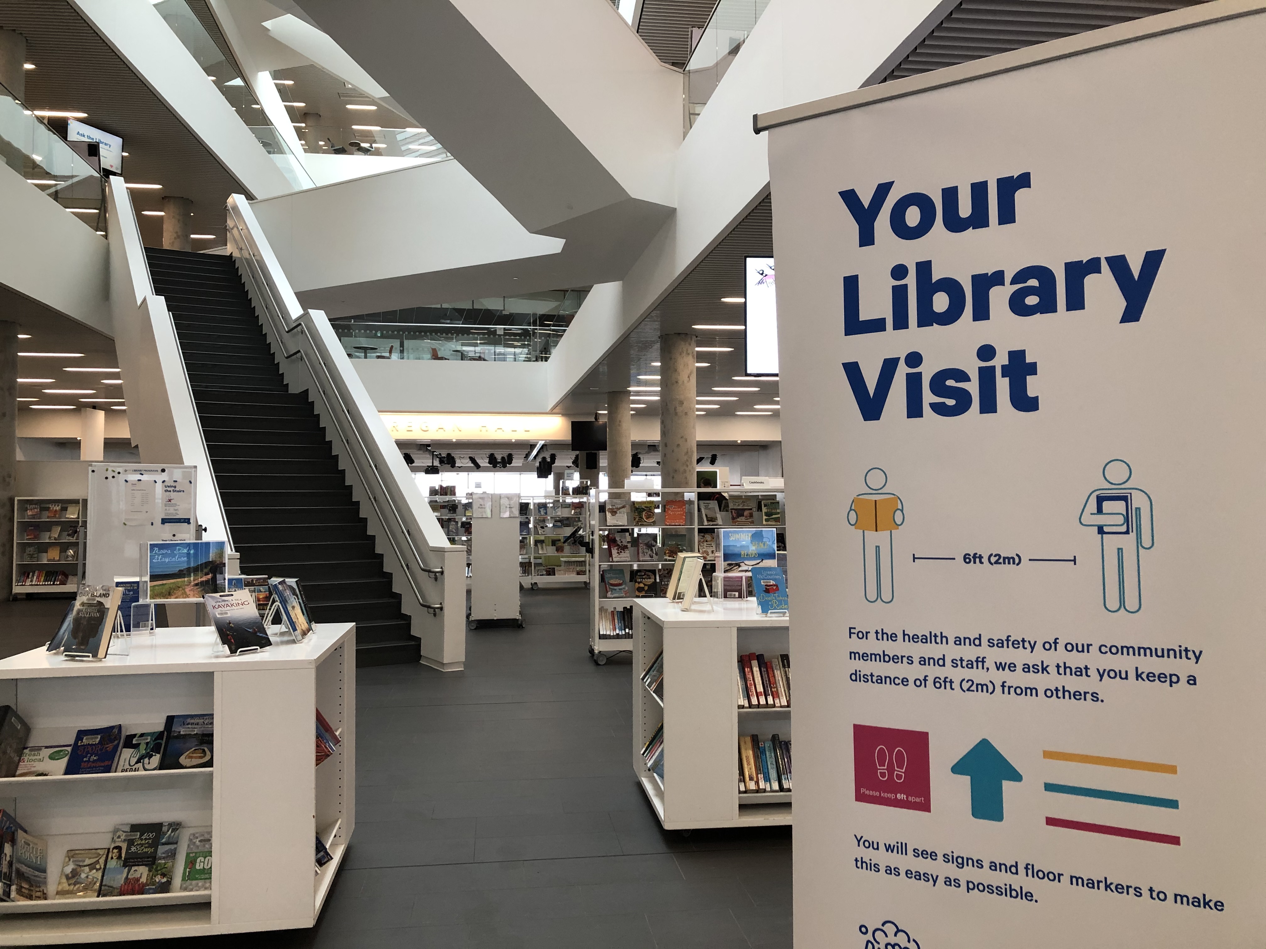 In larger facilities, like the Halifax Central Library, floor decals have been installed to direct public traffic and keep people at a safe distance.
