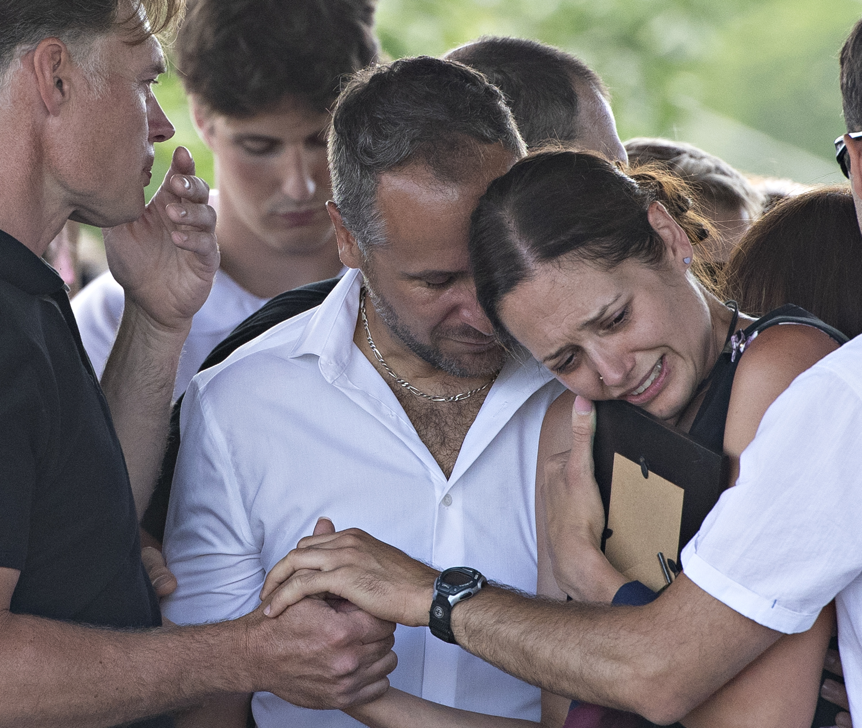 Amélie Lemieux, the mother of Norah and Romy Carpentier, sobbed as she made her way to a makeshift memorial at Chutes-de-la-Chaudière park in Lévis, Que., accompanied by members of her family.