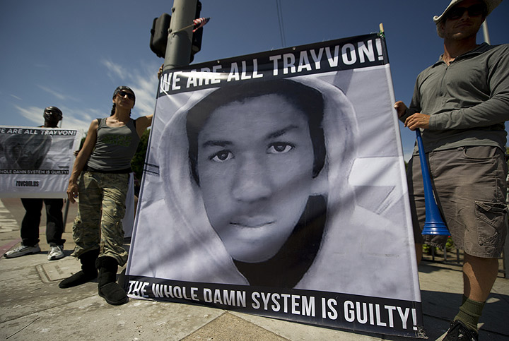 Americans angry at the acquittal of George Zimmerman in the death of black teen Trayvon Martin protest in Los Angeles, California July 14, 2013. (Getty Images)