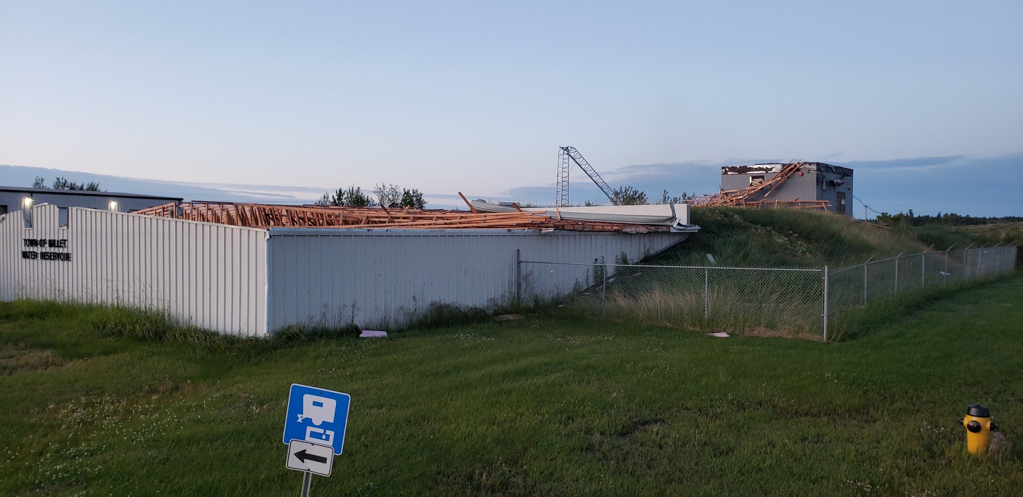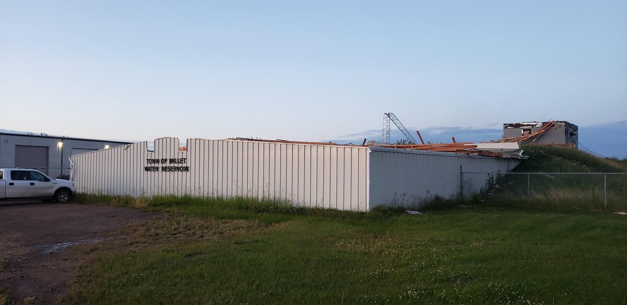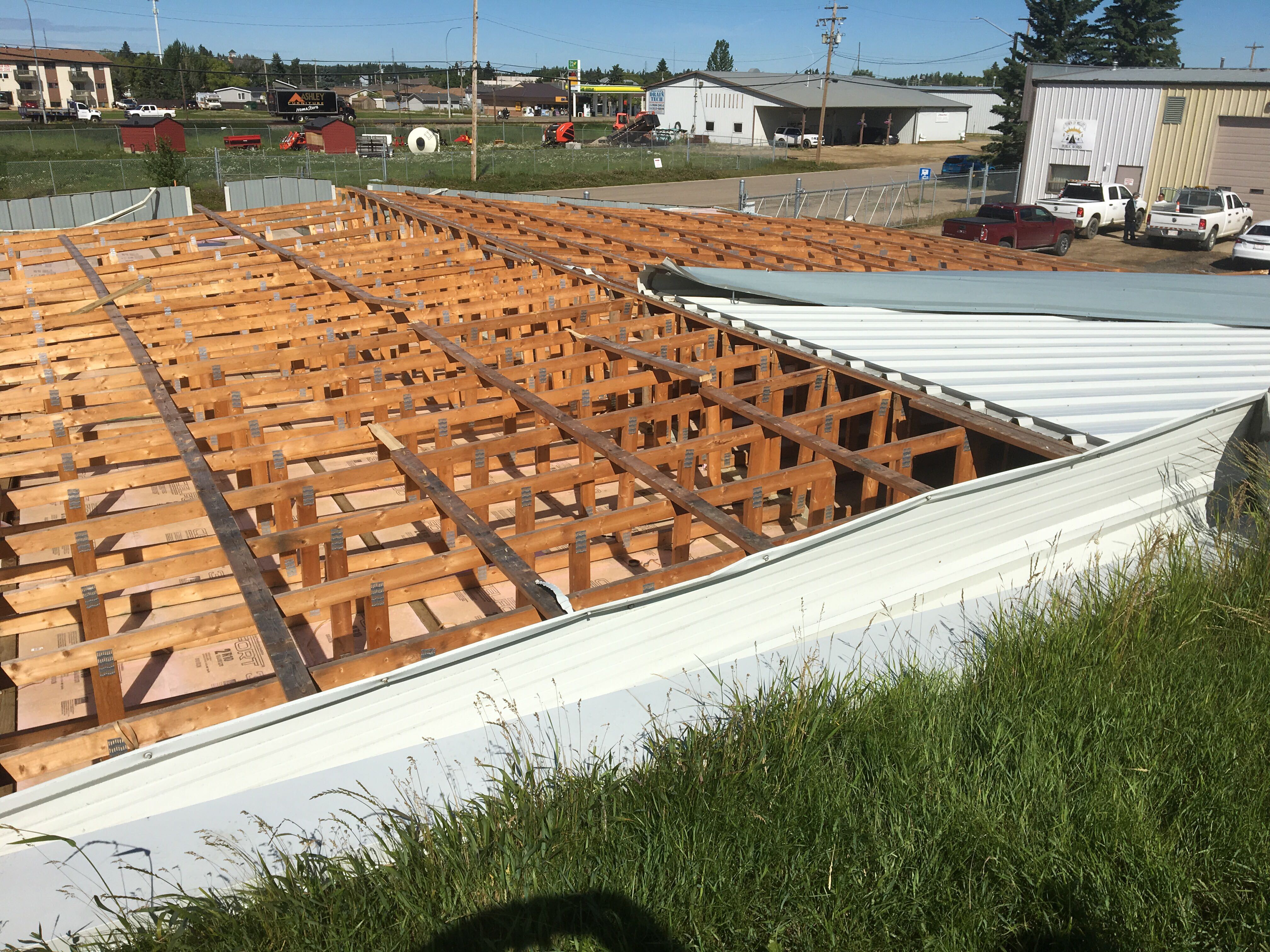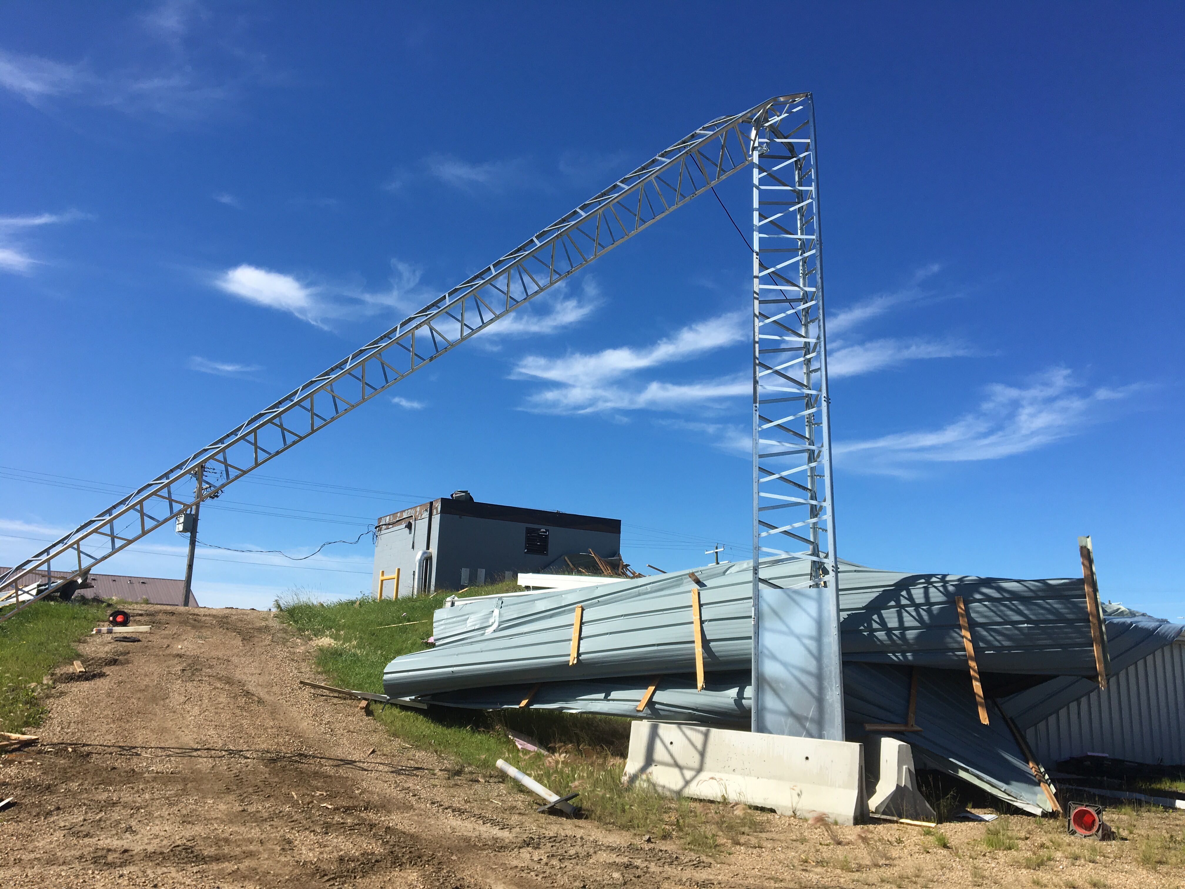 The roof of the town’s pumphouse was ripped off, and damage was done to several houses, buildings and fences. Power was knocked out in part of the town, including at the fire station where backup generators were used so emergency crews could stay in contact with their dispatch centre.