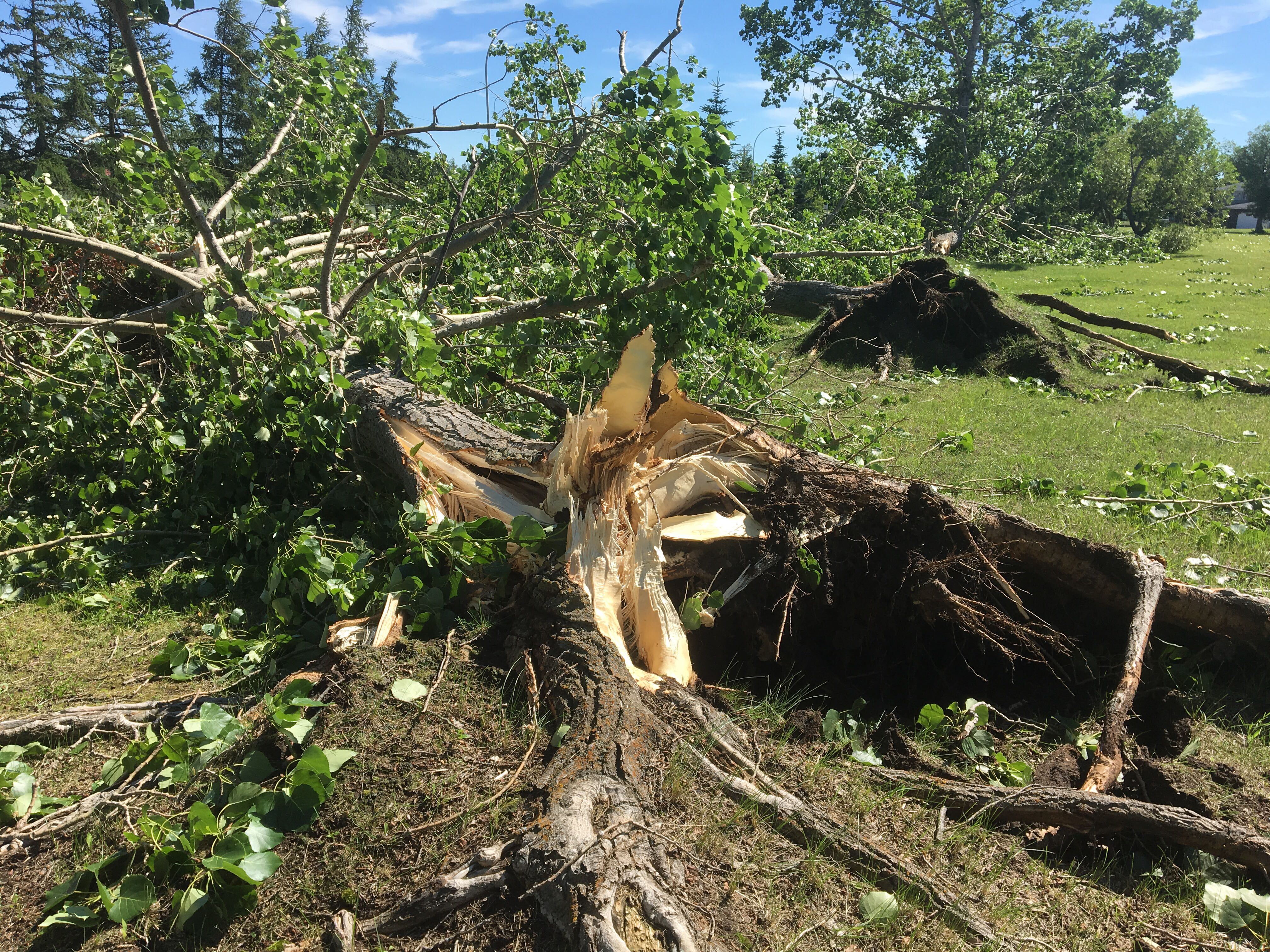 In Millet, Alta., located 40 kilometres south of Edmonton, full-grown trees were uprooted, which led to gas lines being torn up. One subdivision along Range Road 242 was evacuated due to a gas leak.