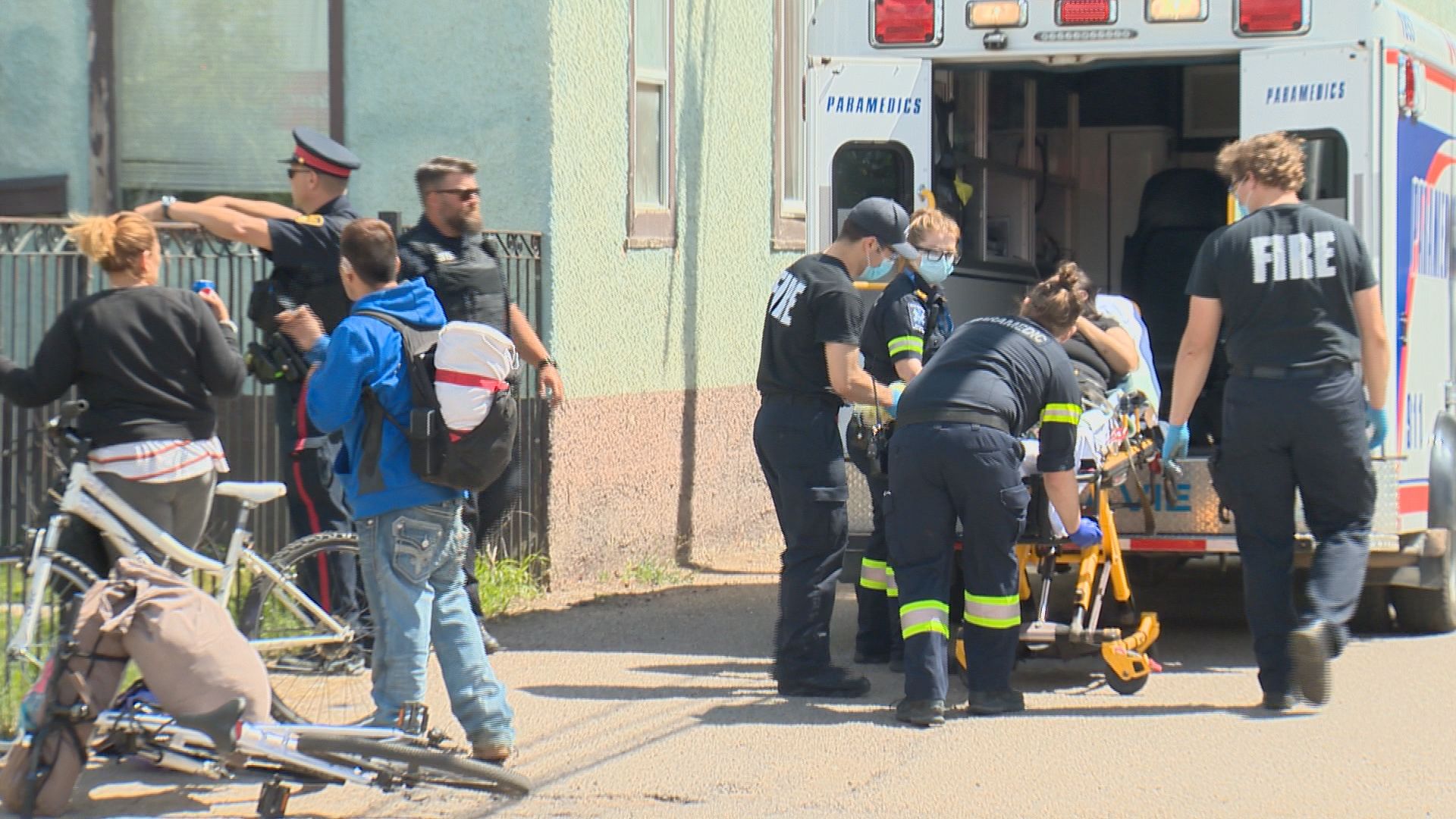 Four police vehicles and a fire truck were out front of a house and a woman in a stretcher was being loaded into an ambulance.