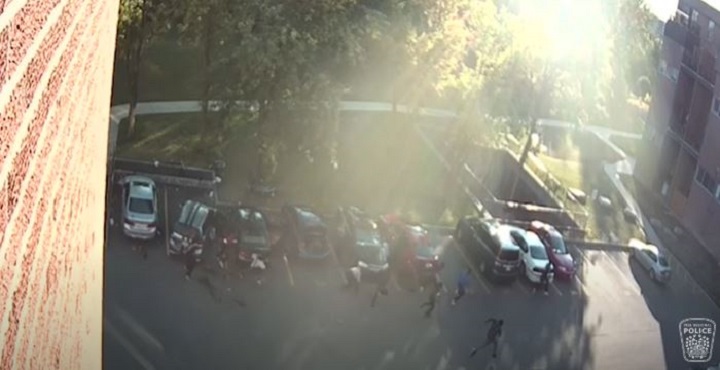In the video, a large group of people can be seen around the building when two vehicles pull into the parking lot. A large group of men with guns come out of the vehicles and almost immediately begin to fire as people attempt to run and/or hide.
