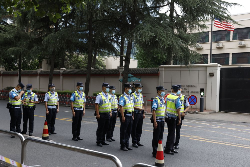 In Chengdu, spectators snapped photos outside the U.S. Consulate on Saturday as police in T-shirts and surgical masks stood on the sidewalk and the closed-off street in front of the walled compound.