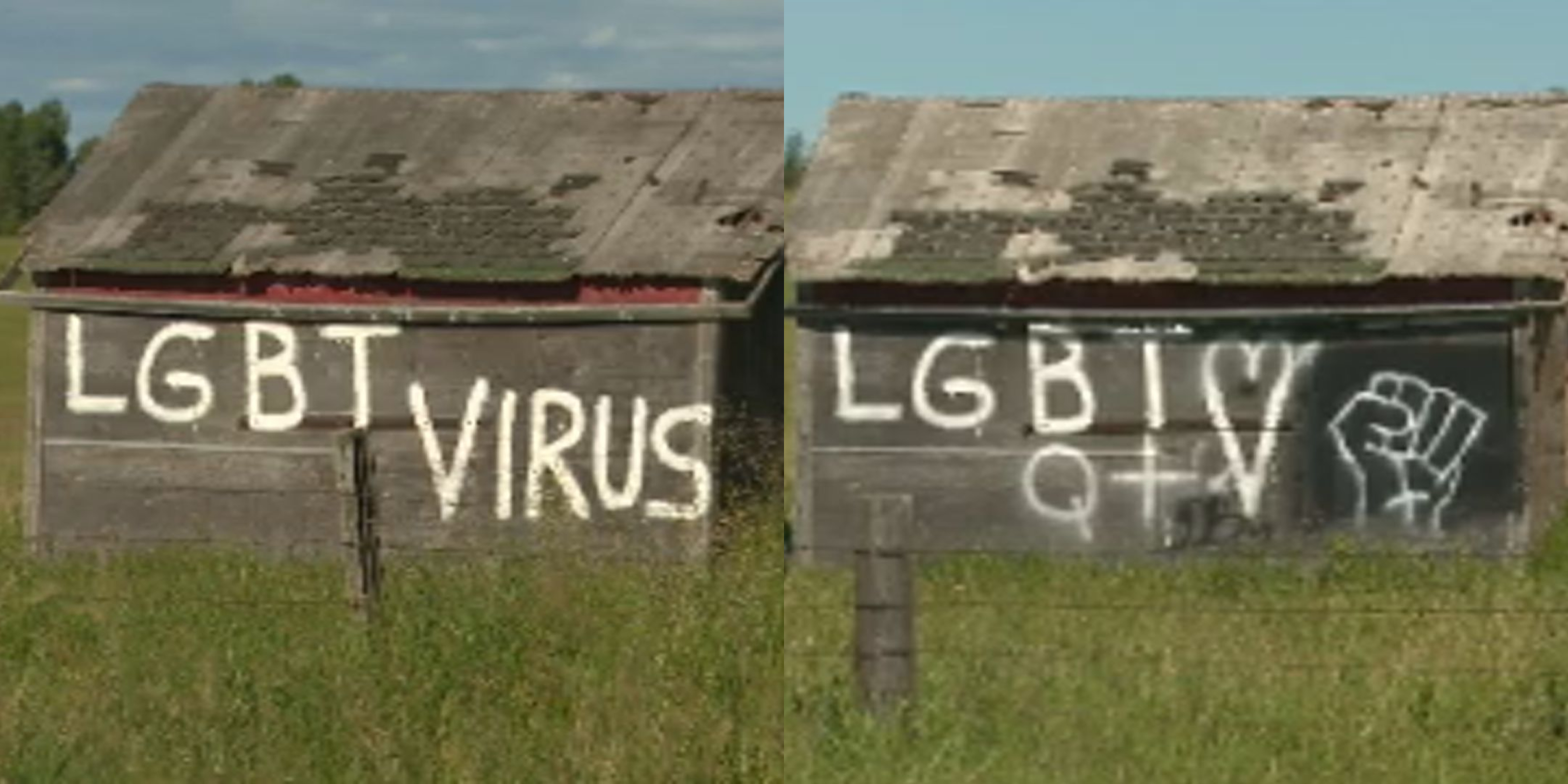 Baker said allies of Airdrie’s LGBTQ community, including companies and citizens, immediately stepped up, contacting the property owner and painting over the hateful message.