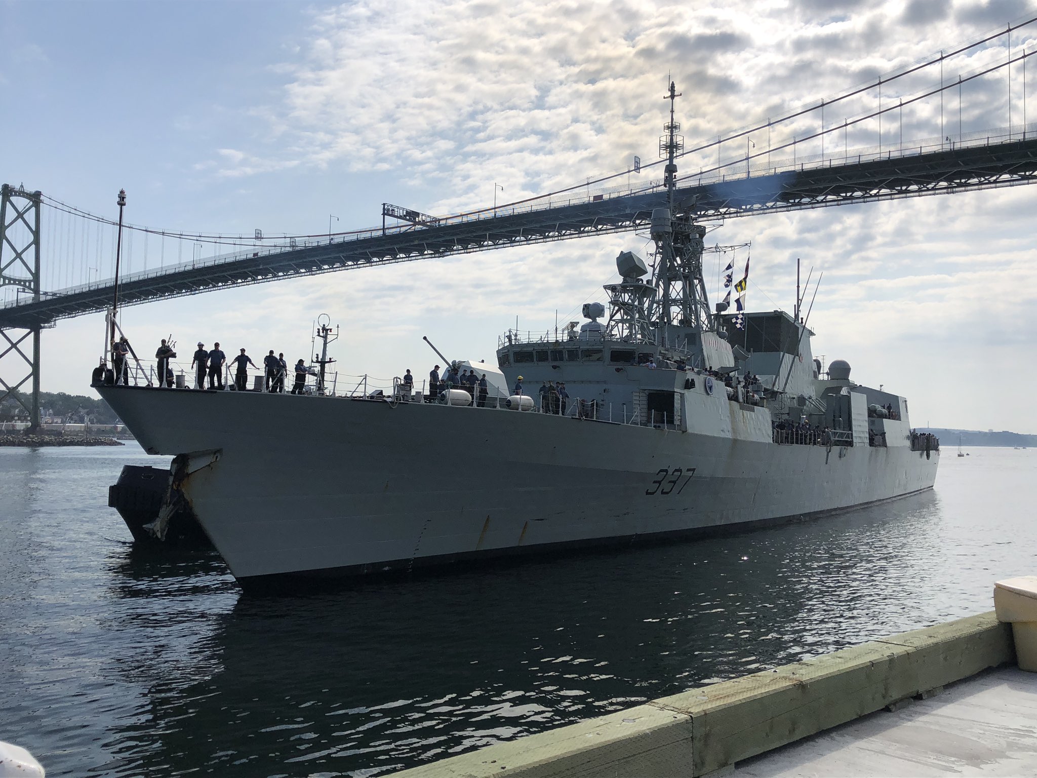 Earlier, Defence Minister Harjit Sajjan and Gen. Jonathan Vance, chief of the defence staff, had boarded the frigate before it reached land and sailed into port with the crew. The ship was officially welcomed by Nova Scotia Lt.-Gov. Arthur LeBlanc.