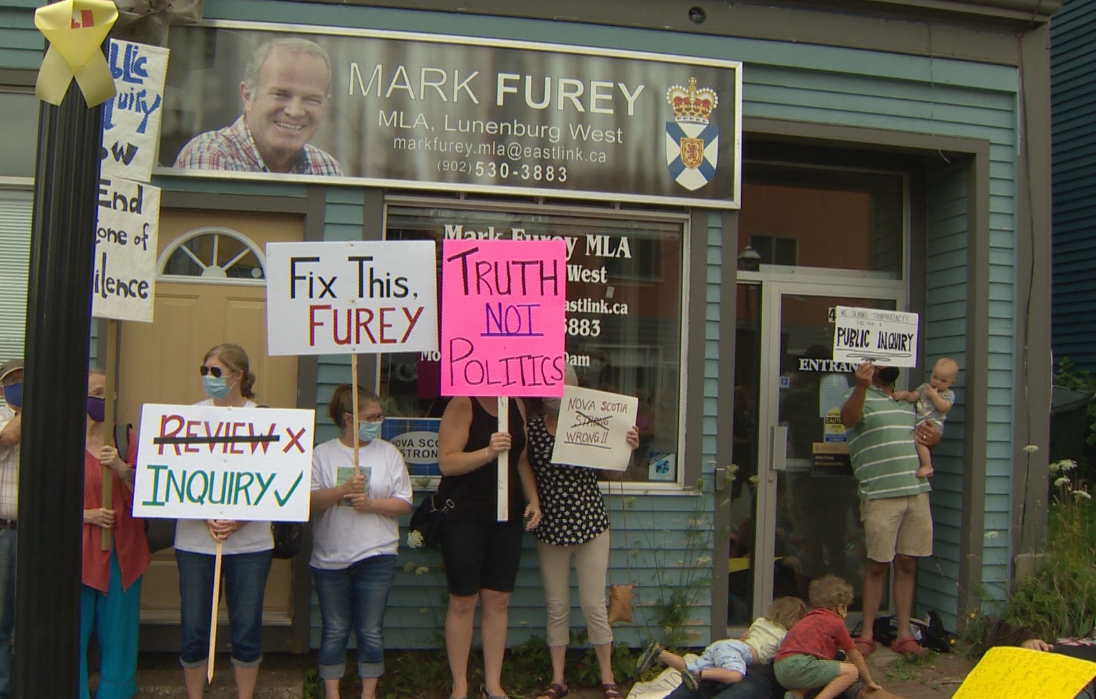 A large group of protesters gathered in Bridgewater, N.S., Monday in front of Justice Minister Mark Furey’s constituency office to voice their frustrations over the failure to call a public inquiry into the April mass shooting that claimed 22 lives.