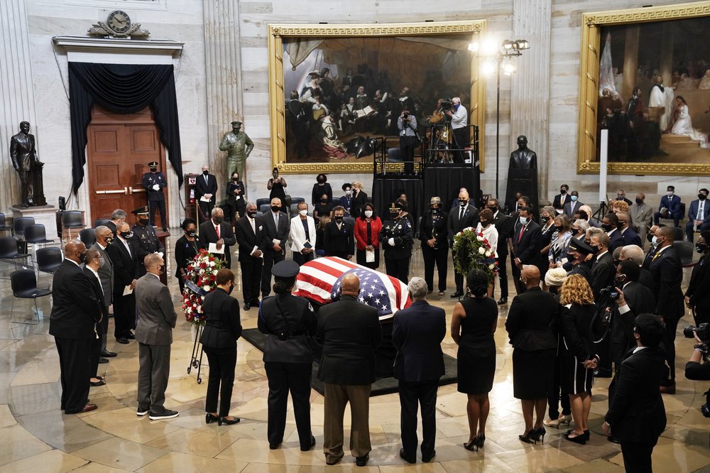 Members of the Congressional Black Caucus wore masks with the message “Good Trouble,” a nod to Lewis’ signature advice and the COVID-19 pandemic that has made for unusual funeral arrangements.