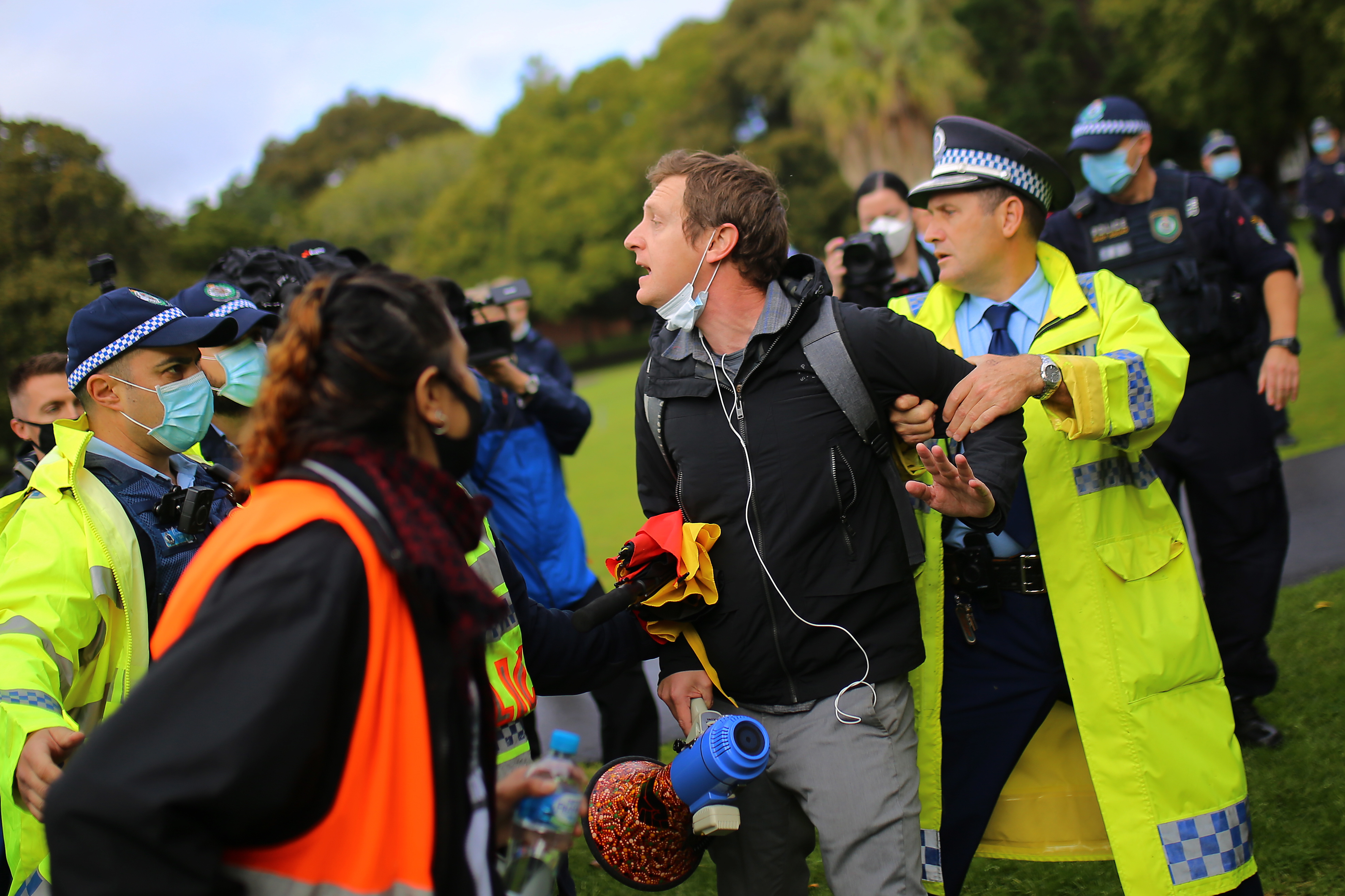 Organizer Paddy Gibson was among six people arrested in a park known as The Domain before the rally was due to start at noon. Two police officers were photographed leading a defiant Gibson away.