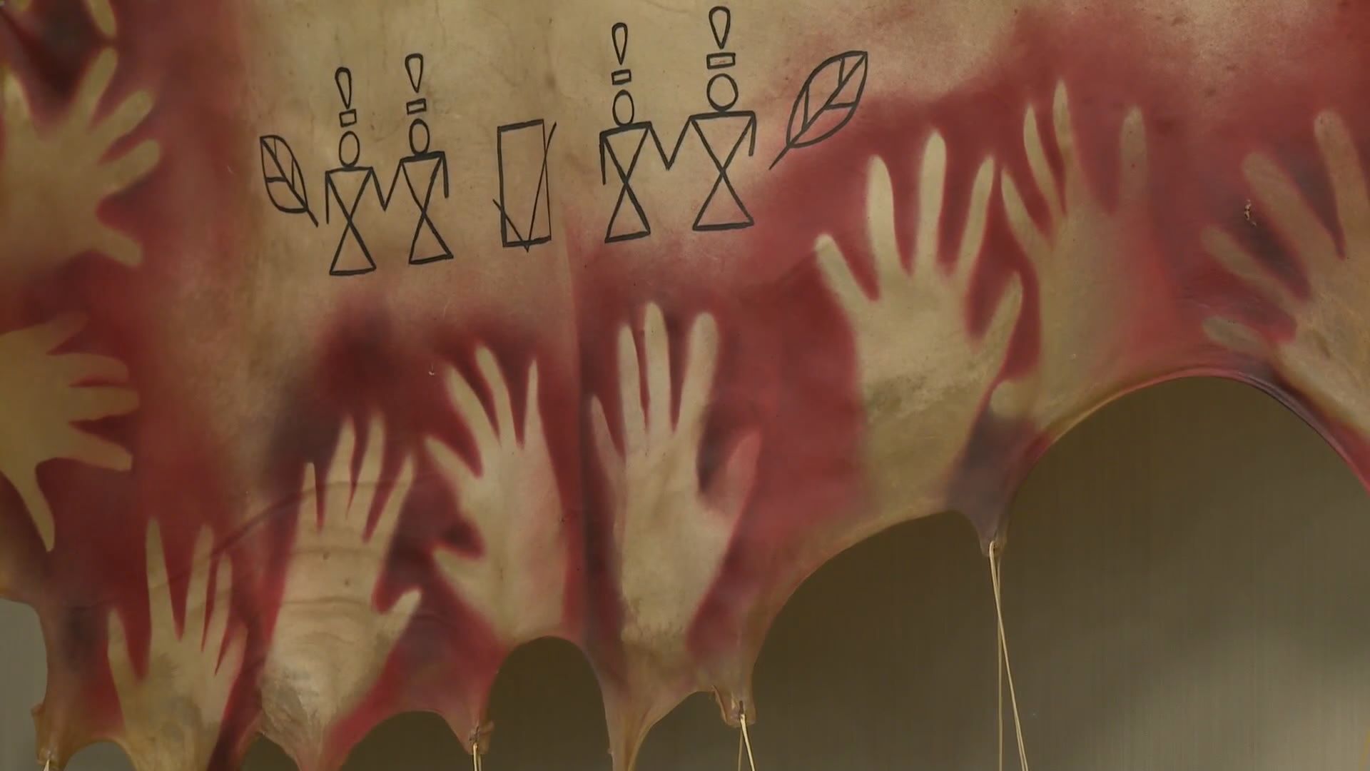 Sticks and handprints frame the hide mural, the title of which reflects a winter’s count.