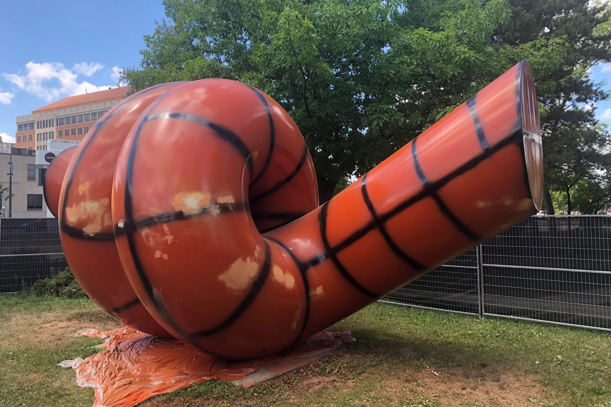 The sculpture, often referred to by locals as the “worm” or the “giant intestine,” is undergoing a $27,000 facelift as the building it fronts prepares for new tenants.