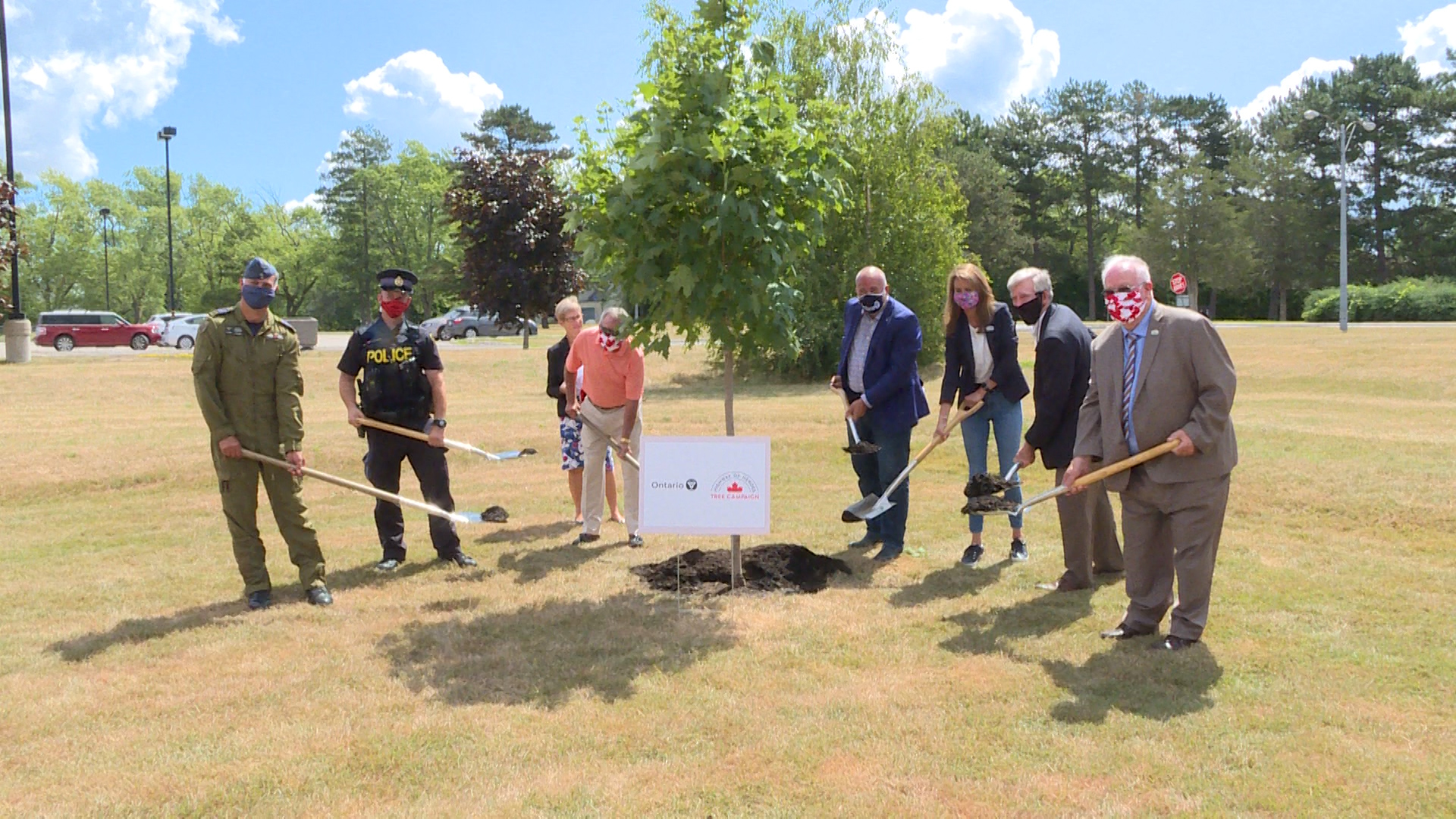 After the announcement, a physically-distanced sod-turning took place before a plaque was unveiled at one of the first trees to be planted at the passenger terminal at CFB Trenton — all a part of the living tribute.