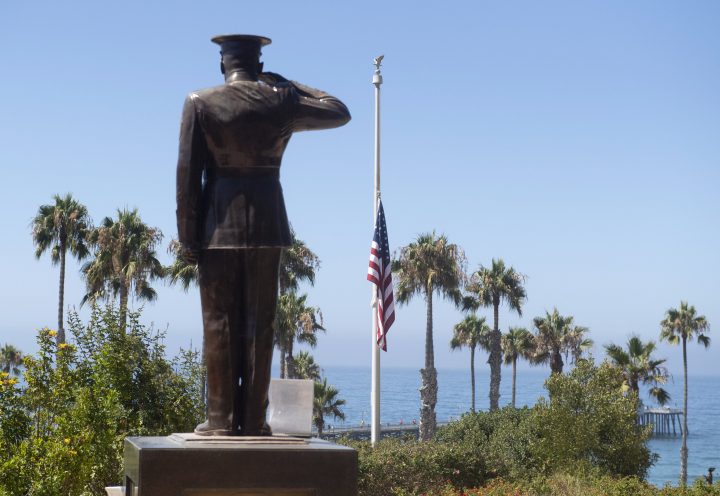 The U.S. flag was lowered to half-staff at Park Semper Fi in San Clemente, Calif., on Friday, July 31, 2020. Officials say a military seafaring assault vehicle with 15 Marines and a Navy sailor aboard sank off the coast of Southern California, leaving one of the Marines dead and eight missing. A Marine Corps spokesman says they were traveling in the amphibious assault vehicle from the shores of San Clemente Island to a Navy ship Thursday evening when they reported that the vehicle was taking on water. (Paul Bersebach/The Orange County Register via AP)