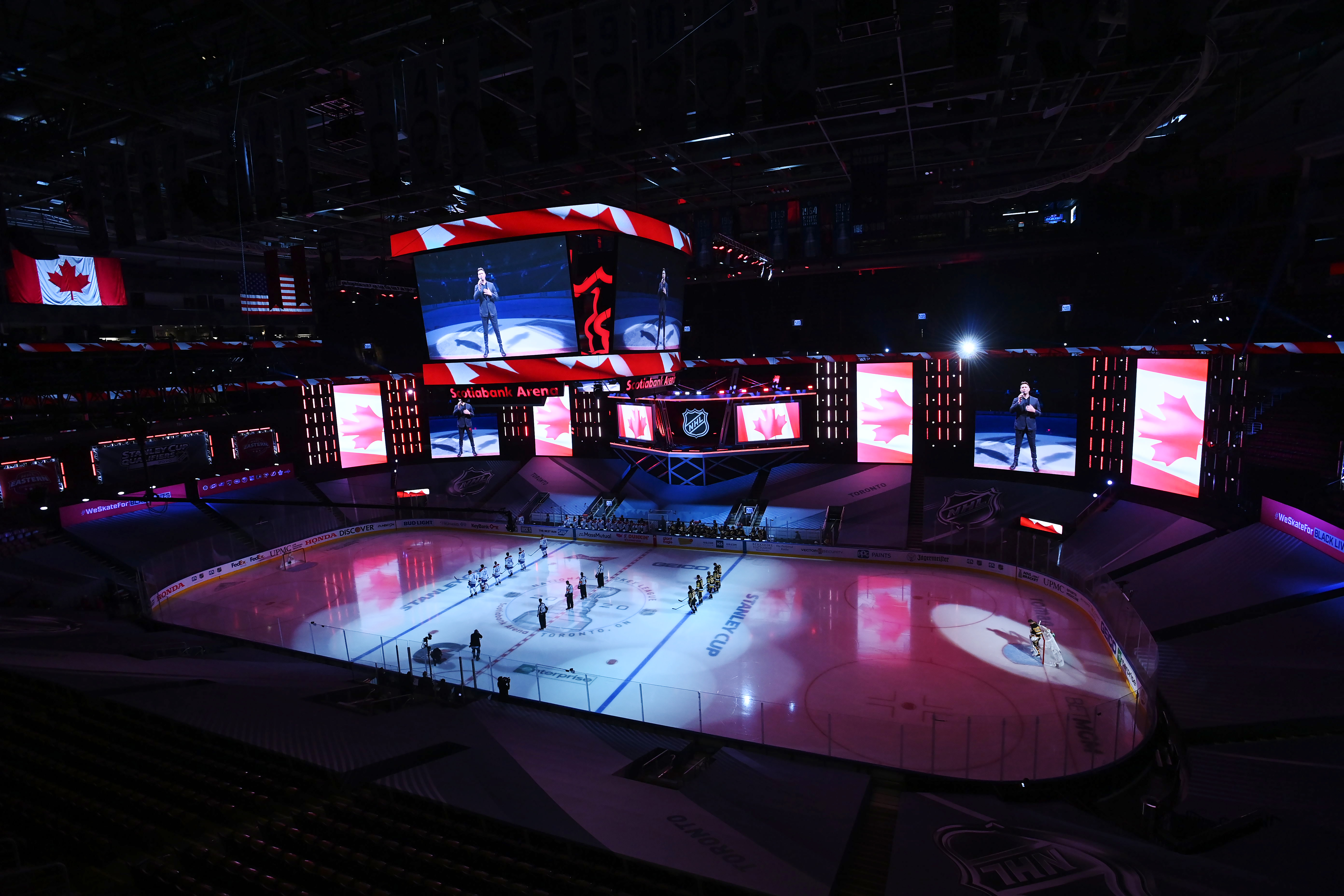 It was also used before the Edmonton Oilers-Chicago Blackhawks game at Rogers Place in Edmonton, the other NHL hub city, earlier Saturday.