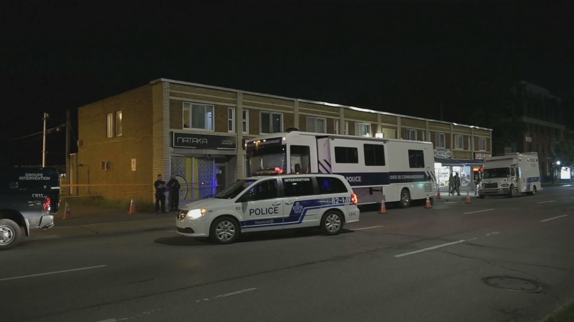 A police command post was parked outside the apartment building on Henri-Bourassa Boulevard East on Friday.
