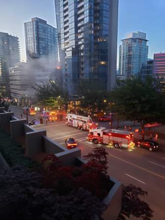 VFRS got the call at about 8:40 p.m., with reports of smoke billowing from the seven storey structure at 1475 West Georgia Street.