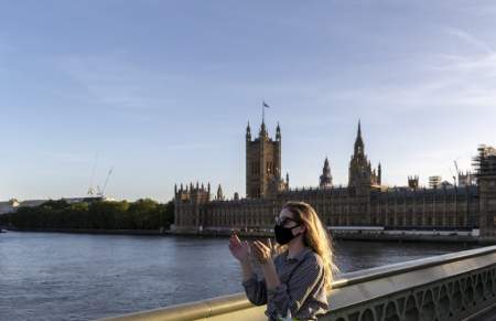 LONDON, May 29, 2020 A woman wearing a face mask takes part in the weekly ''Clap for our Carers'' for the last time in front of the Houses of Parliament in London, Britain, on May 28, 2020. (Credit Image: © Han Yan/Xinhua via ZUMA Wire)
