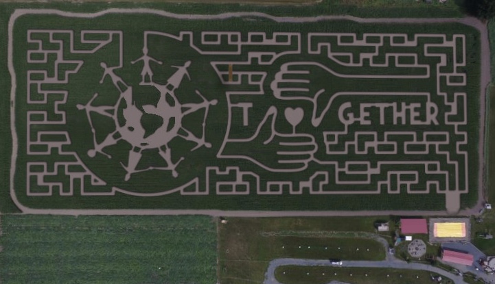 From above, the seemingly random maze of pathways cut through a 12-acre corn field resolves into a pair of hands holding a heart, and the message “together.”