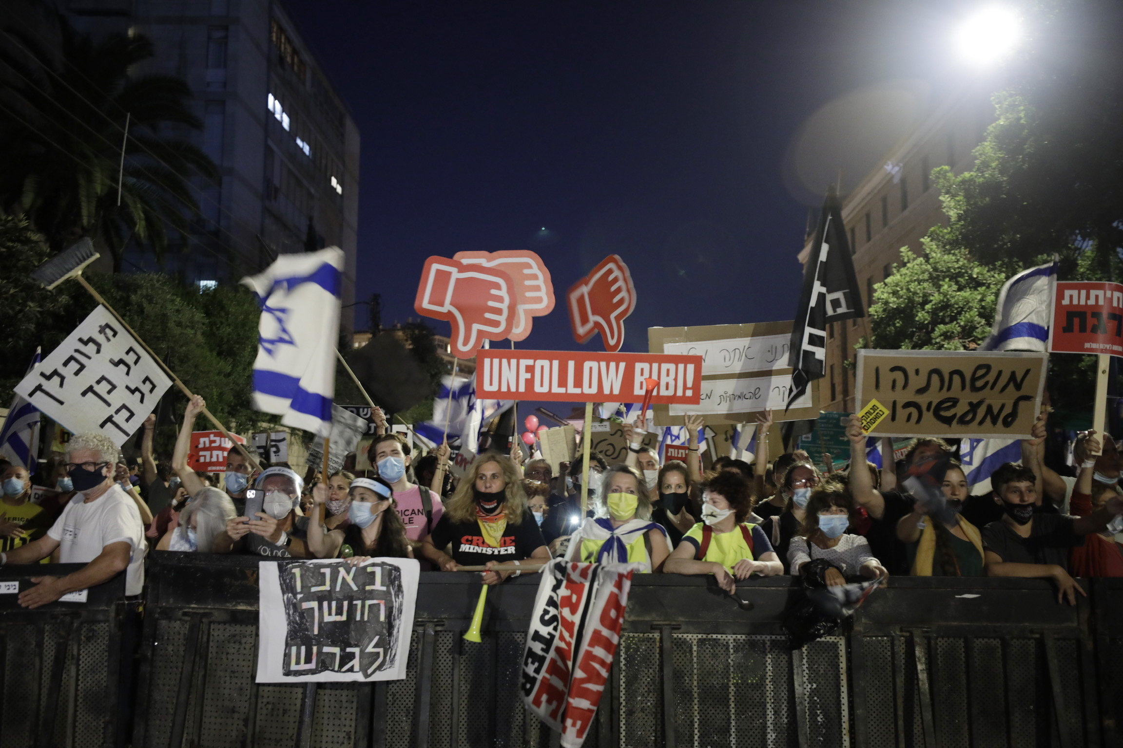 Thousands of people thronged central Jerusalem late Saturday, blaring horns, hoisting Israeli flags and chanting slogans against Netanyahu. A smaller protest took place near Netanyahu’s private beach home in the upscale coastal town of Caesaria, while other gatherings took place on bridges and intersections across the country.