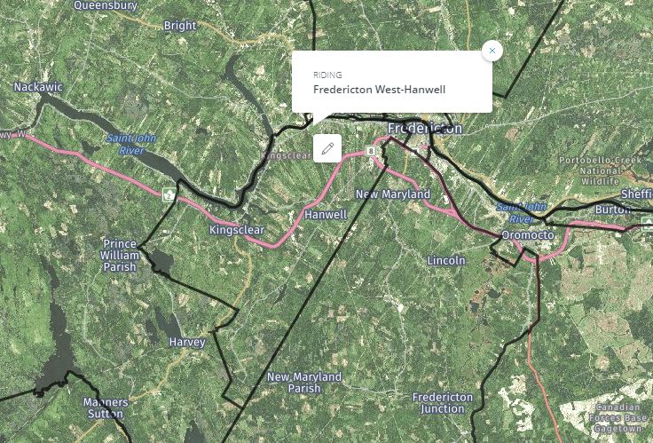 Fredericton West-Hanwell district includes the southwestern part of Fredericton and neighbouring communities of Hanwell and Kingsclear and the Kingsclear First Nation.